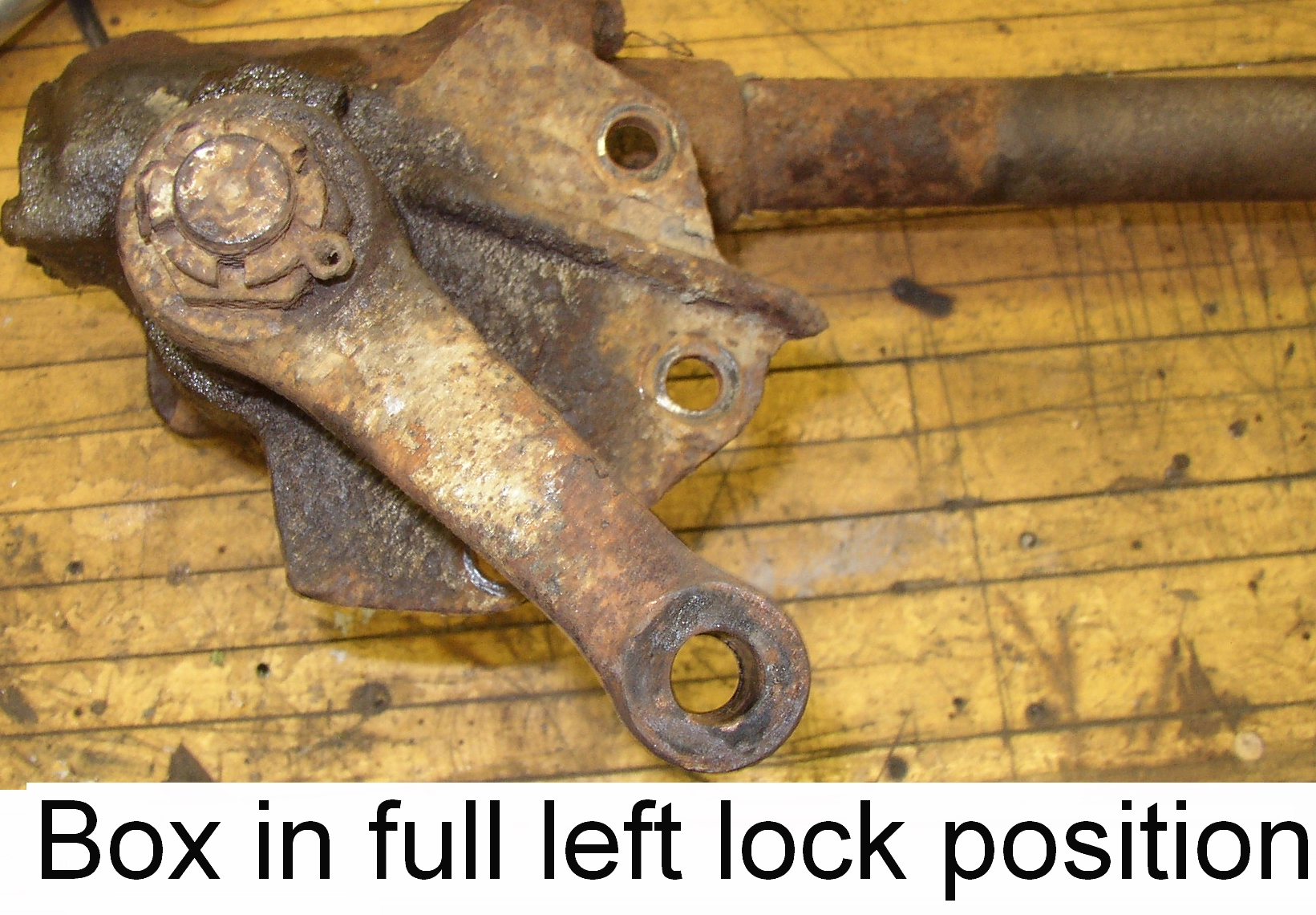 I didn't know if the pitman arm was indexed onto the pitman shaft or not (most are) so I figgered I'd shoot a couple of reference pics of the arm at each lock point. Good thing I did, 'cause the pitman shaft is NOT indexed to the shaft....