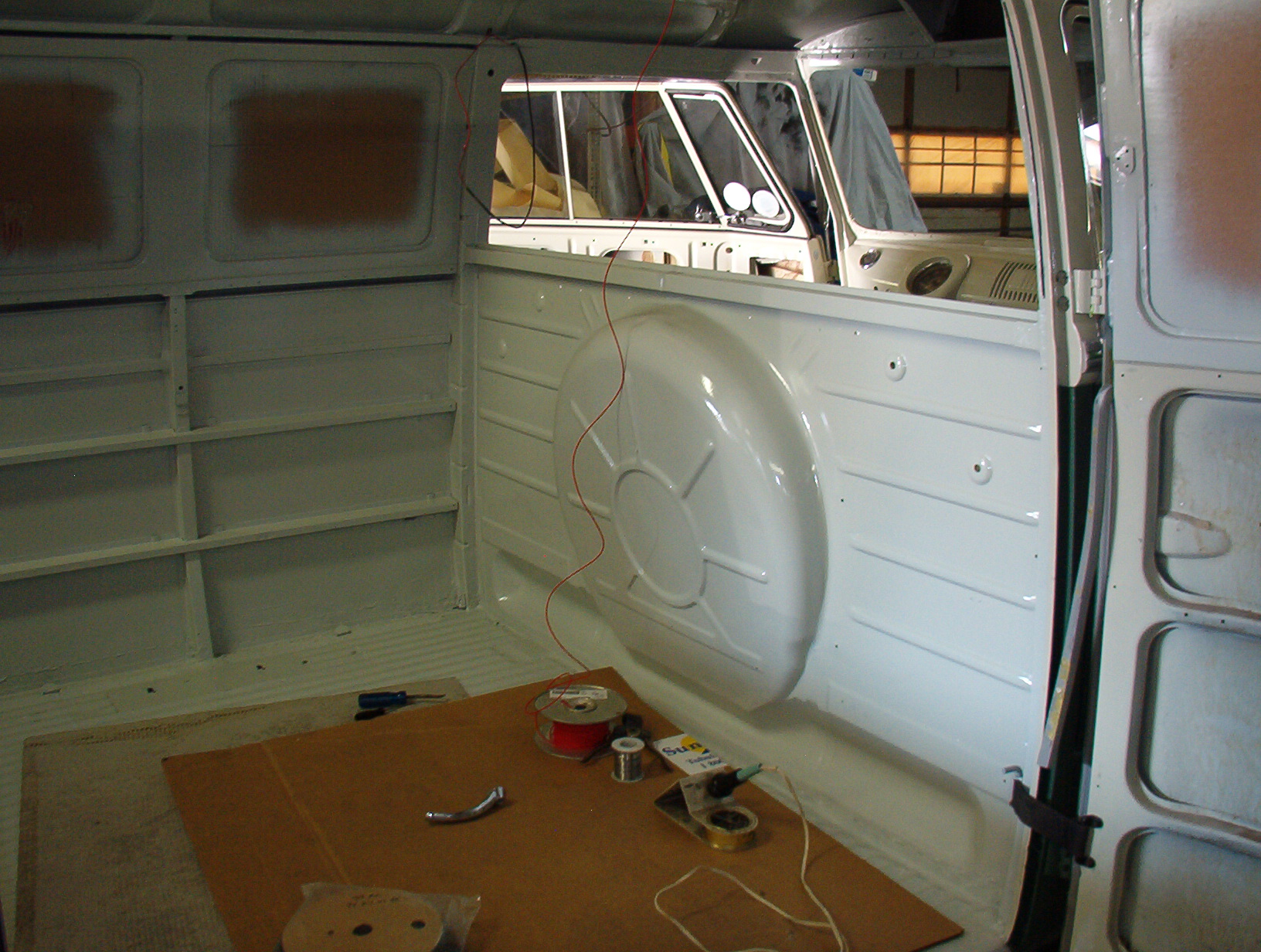 I’ve spent a ton of time prepping the cargo doors, both inside and out, to get into primer. A big wire wheel works great to get the glue removed from the weatherstrip channel, but there’s constantly little wires flying around the shop coming from the wheel, endangering nearby personnel. Good thing for safety glasses. I’ve pulled stray wires from my flesh several times and they are constantly stuck in my clothes……