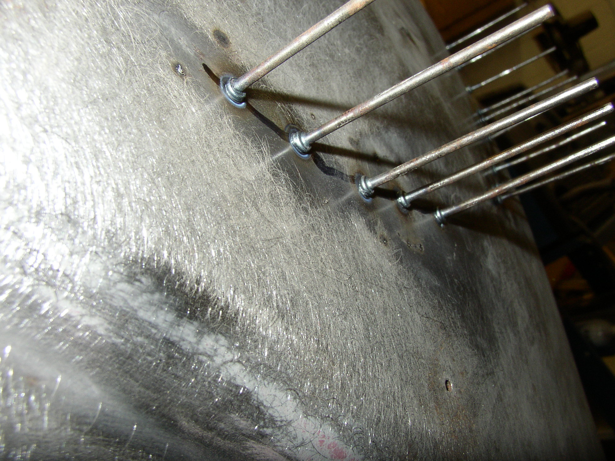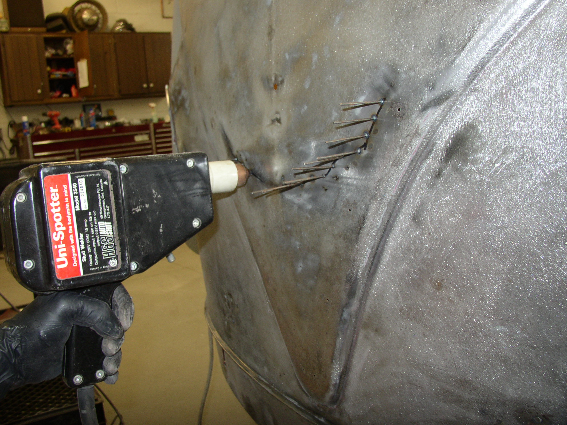 Chuck helped sling more mud, but it wouldn't show up in pictures anyway. The cool thing I bought was a pair of Shrinking Discs which were recommended to me by several people, I've only used the big one, but very happy with what it does. After working out a dent, you invariably have a high spot or bump from the metal being stretched. The shrinking disc heats the bump using friction, similar to what a torch would do. After heating the bump, cool it with water or shop air, and the bump levels out. Quite impressive! Once again, pics wouldn't show this as we’re only talking about 1/16” or maybe 1/8” max here. It flattened out several high spots for us but did not work on one that is on a weld line- evidently the high spot has to be in regular sheetmetal, but for those it’s great!