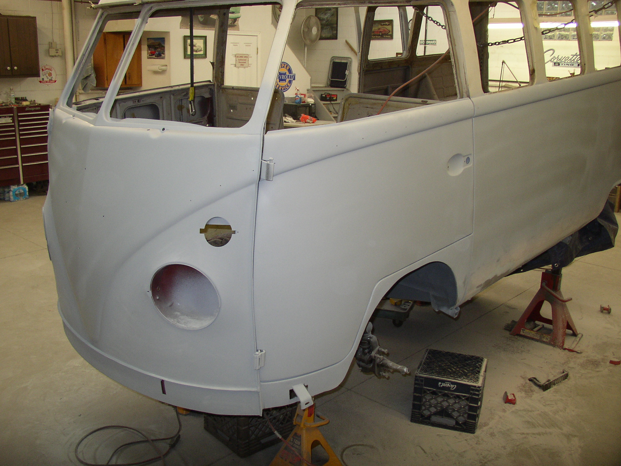 I removed the Bondo from the dent in the middle and worked it out from the inside, it came out quite well and will only need a skim coat instead of the 3/4" it had. I stripped the paint to find many coats, this was a '67 Deluxe door- it looks like the original bus was yellow bottom, white top, and repainted blue, but there's no factory yellow color in splitties, so I guess it changed color at least twice in its life. There might be 7 layers if you count primer- 2 blues, yellow, and white.