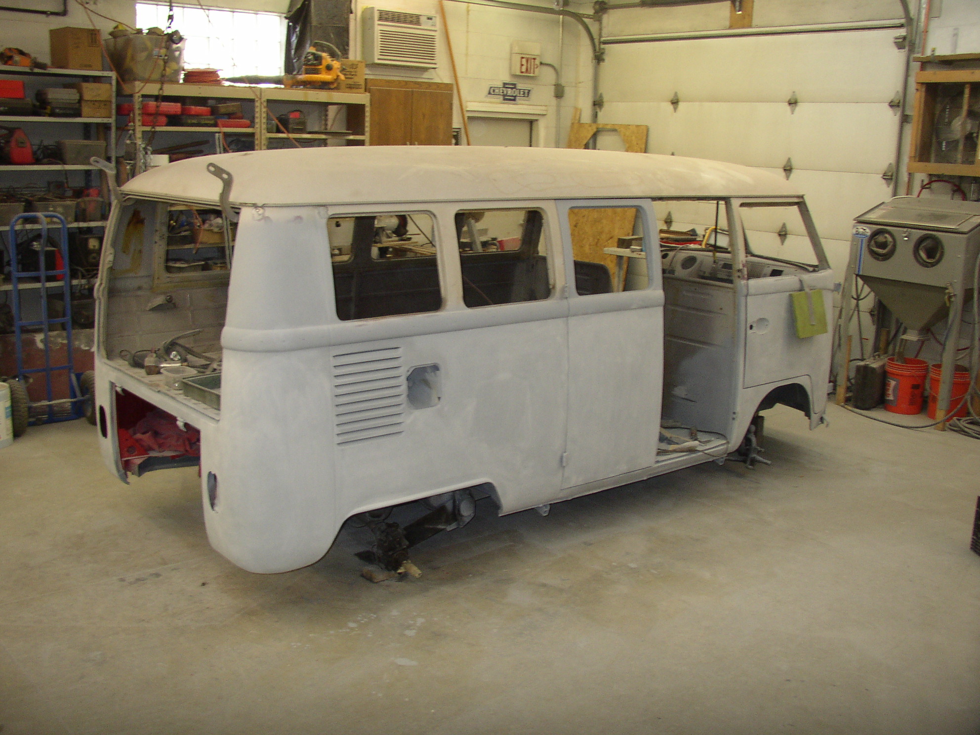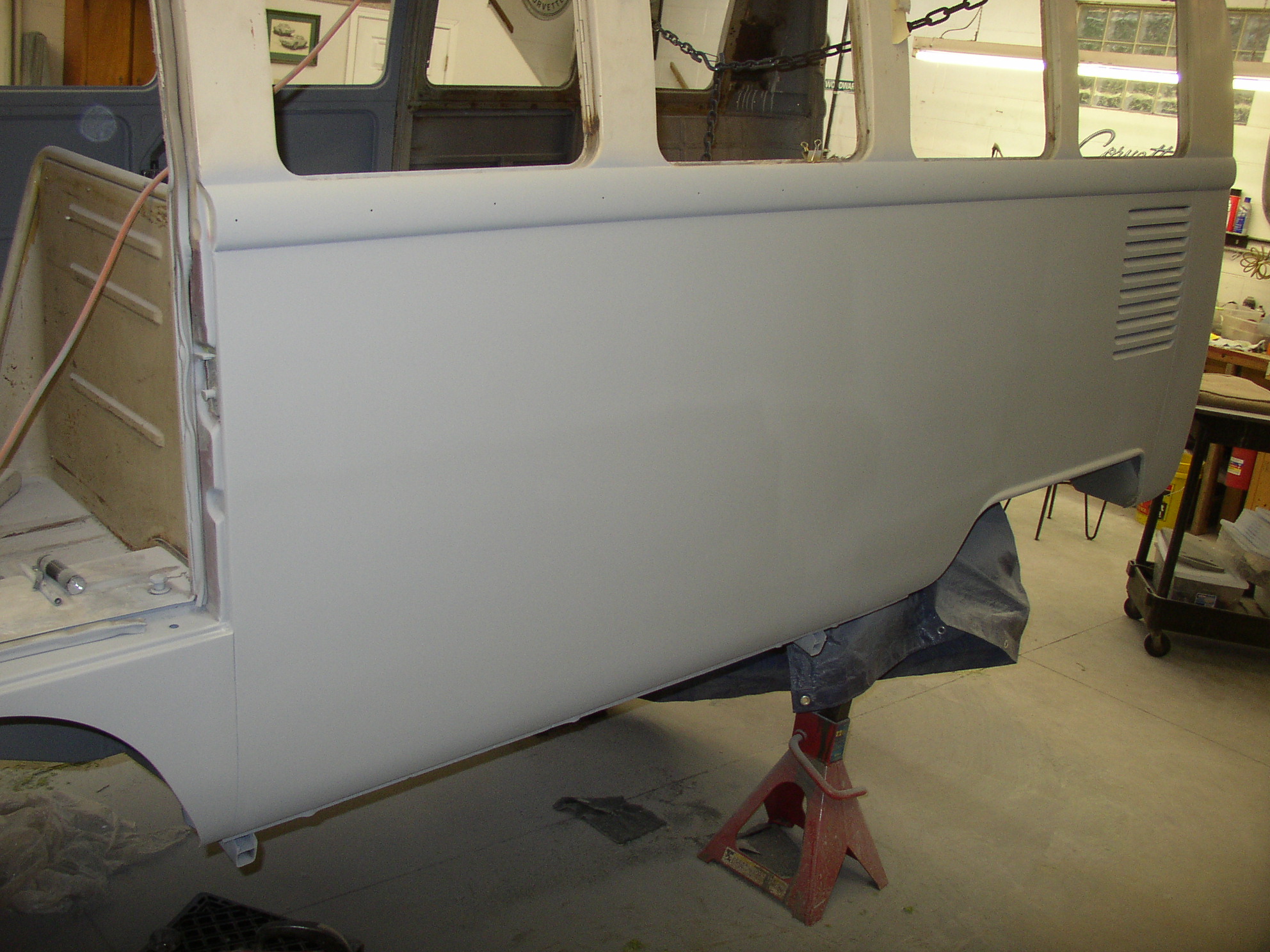 I removed the Bondo from the dent in the middle and worked it out from the inside, it came out quite well and will only need a skim coat instead of the 3/4" it had. I stripped the paint to find many coats, this was a '67 Deluxe door- it looks like the original bus was yellow bottom, white top, and repainted blue, but there's no factory yellow color in splitties, so I guess it changed color at least twice in its life. There might be 7 layers if you count primer- 2 blues, yellow, and white.