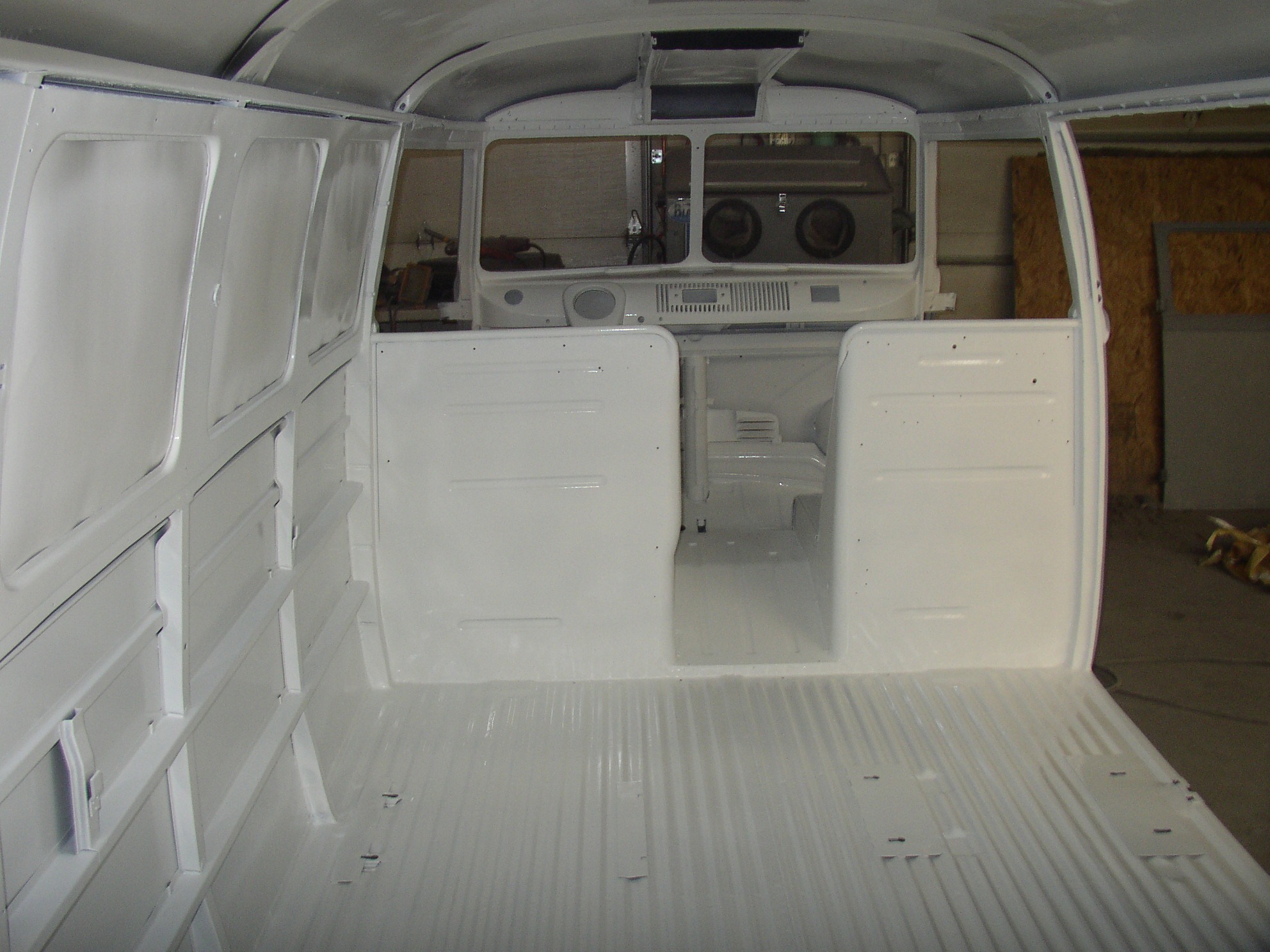 Finally got some time dedicated to the bus and got a lot done but not without a big hitch. Monday I finished prepping the interior with dabs of mud, weld and etc to fix all of those little things that show up in primer. I masked the bus and left the heat on warm all night so I could shoot yesterday on warm metal. I went in early (10 is early for me) looking forward to shooting the PPG DelFleet paint I bought a couple of months ago. I usually use the cheap stuff (Kirker) which I've had good luck with for decades but this time I was talked into the good stuff by a local authority (to be named later). I read the instruction sheet again and mixed the paint using a digital scale to exact gram measurements. The surface temp was 75ish with an IR gun when I started and shit went wrong from there in a big way. I was having no luck at all with this paint- thin, ran, wouldn't cover, wouldn't set up, I meant this shit was bad. It was like shooting milk from a spray gun. I called Chuck with a 'WTF am I doing wrong' tone of voice, he came right out and arrived at the conclusion I got a bad can of paint. Luckily I had 1.5 gallons of white Kirker in the cabinet, so I switched to that and had much better luck. All in all, a good day in the long run.
