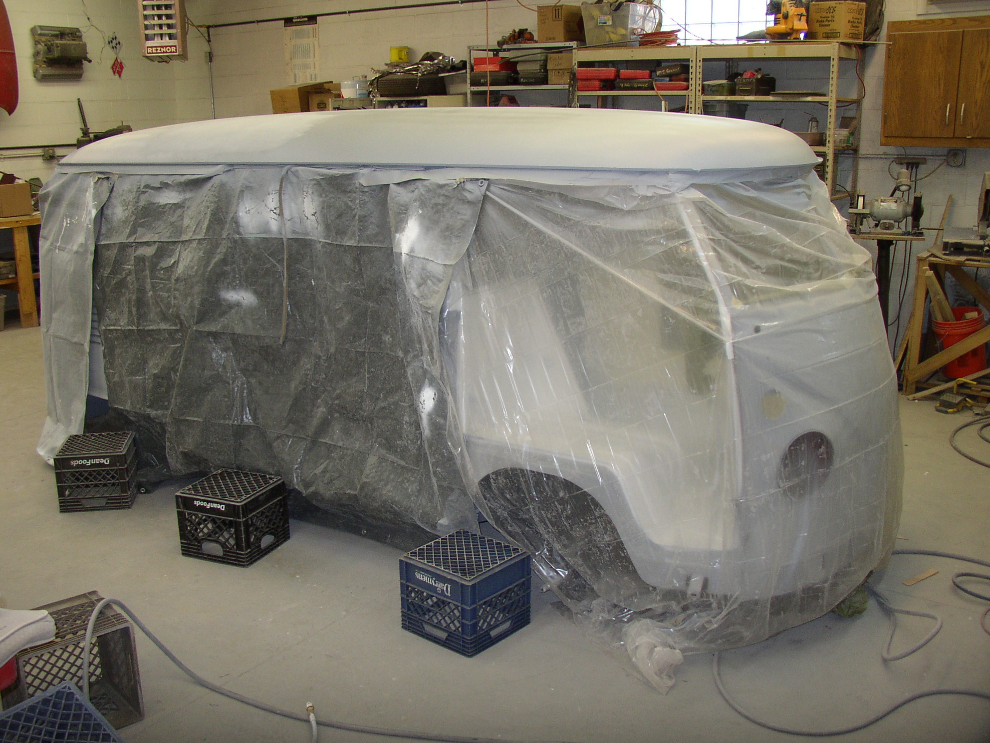 3+ weeks ago I was at 505 hours but I've been working out of town every week since. I have snuck a few days in so my hours are probably at 530 right now with still not a lot to show for it. I have the complete interior primed but that shows up all those pesky little things that still need a dab of mud or TLC, so that's where my time has been spent. The dash (radio repair plate) is mudded, sanded, and ready for color. I made some heat deflectors so the overhead furnace radiant tubes in the shop don't roast the top of the bus so badly. I visited Bill and believe my colors and upholstery are picked out and will get those ordered soon (tomorrow). Christmas activities are also crowding my shop time, I wanted to get out there today but didn't make it. I still need to make a present for my wife and still have travel for work to get in. I doubt color will be going on this month but it's certainly not back burner.