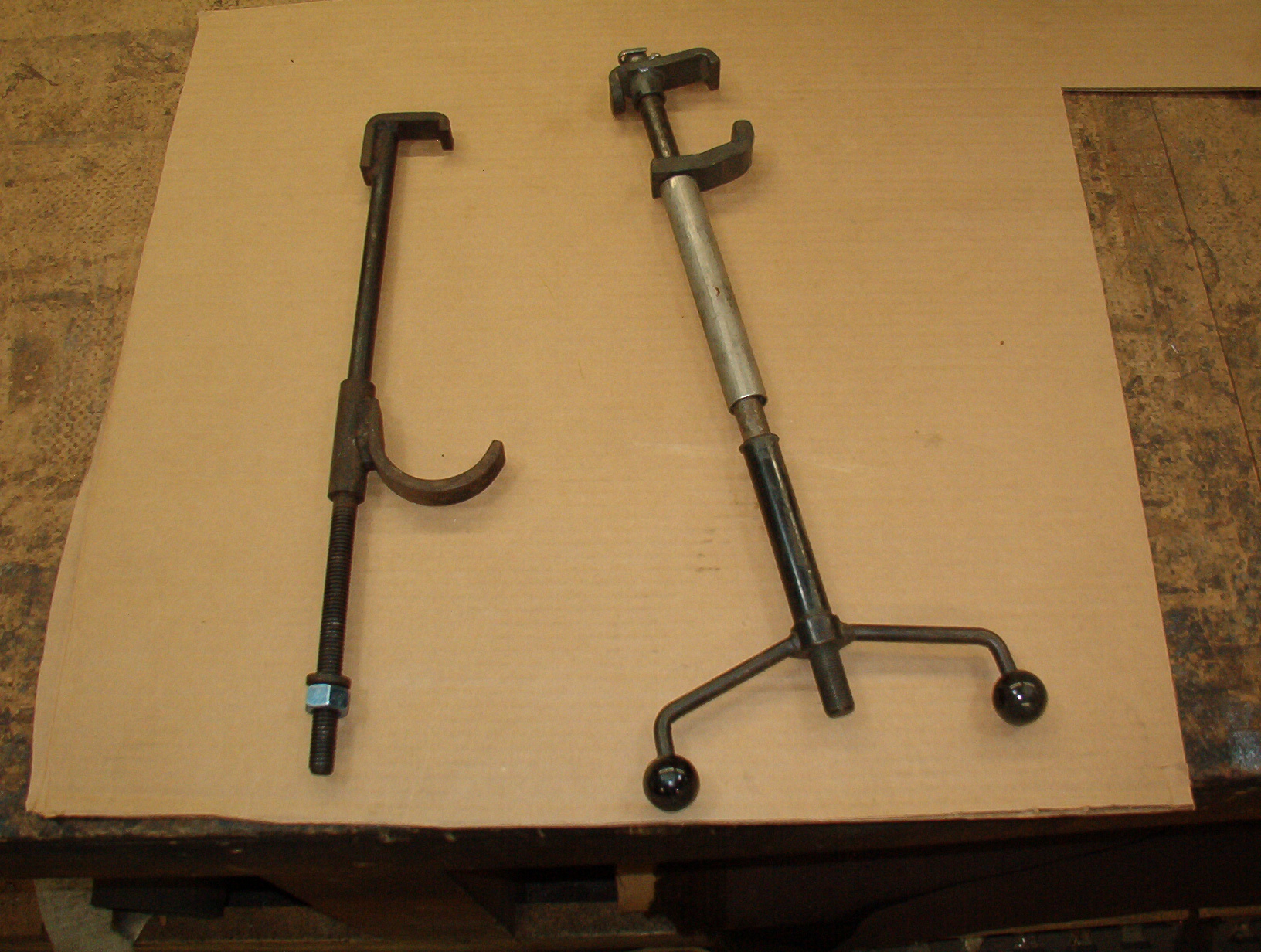 I changed the axle boots, and to do this the axles need to be level. On a Type 1 this is no problem, but in a Bus with no engine you can't get the torsion bars compressed because there's not enough weight. I fabbed up a tool to go between the shock mounts and compress the bars to level. Eat your Wheaties!