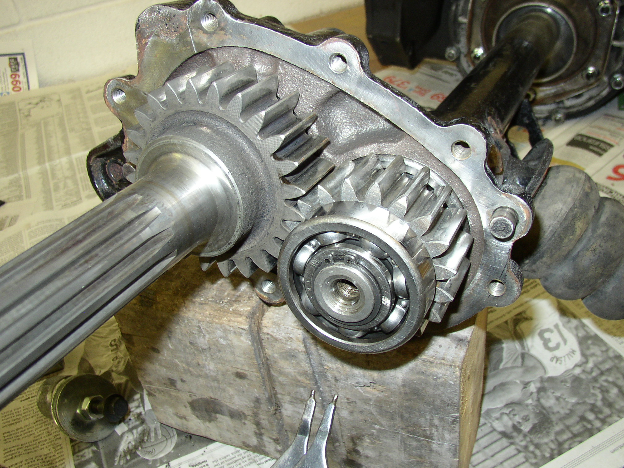 This was the other side- the frigging plastic shim/thrust bearing was missing in the trans! It should have made a clunk on turns and maybe shimmied or wandered going down the road but I never noticed it. The thrust shim is a spare I ended up using.