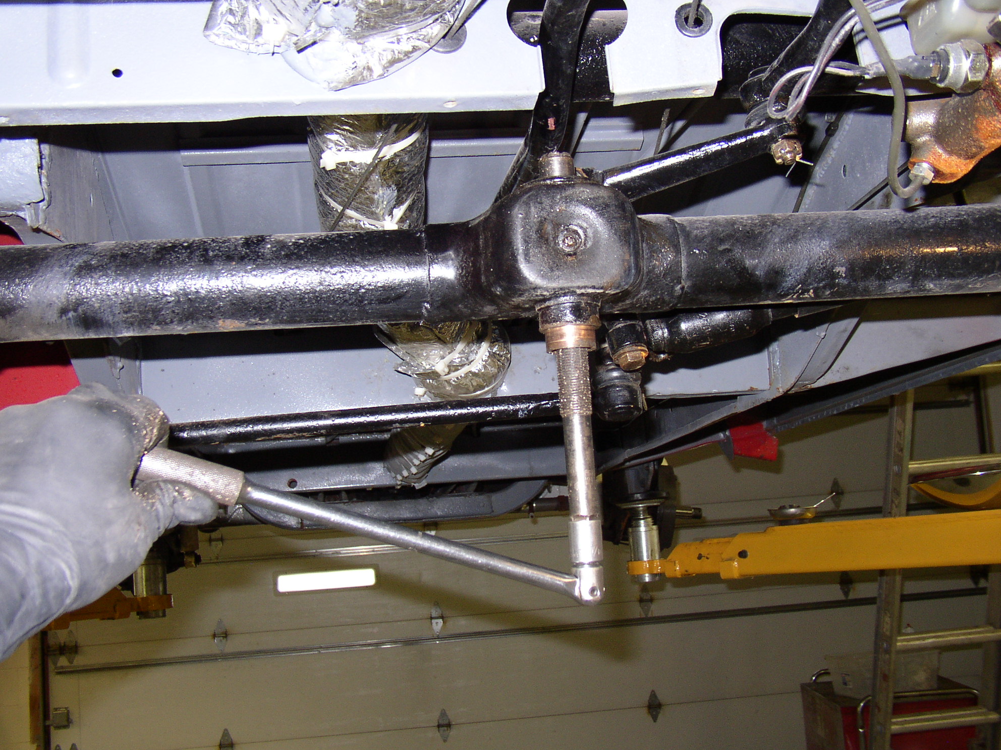I "cheated" when I did the resto- the front end checked out as tight, so I cleaned it, painted it and figured I'd address any problems later. Well, later is here, and 3k miles proved the center pin to have a slight bit of slop in it along with one slightly sloppy tie rod end. Well, it's time to do the center pin. The Samba gang has a huge thread on this so I'll just post the details.