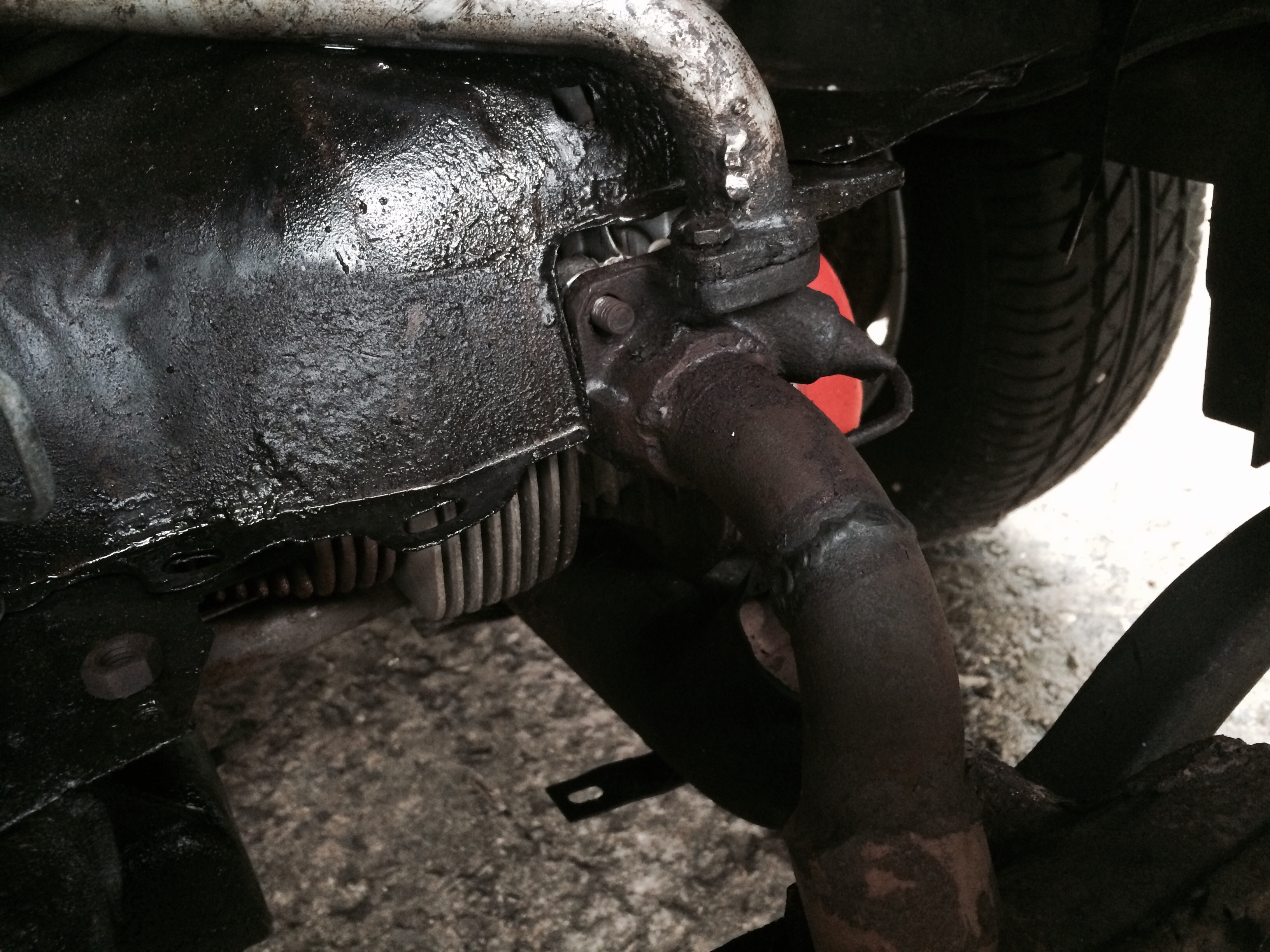 Exhaust nuts came out okay on the front for the most part, studs came out on the left hand side. They were not standard either. Rear nuts are proving more difficult. Soaked them a bit more with penetrating oil and will try them later. Looks like I will need to cut the muffler where it is welded to the heater box to get it off the studs.