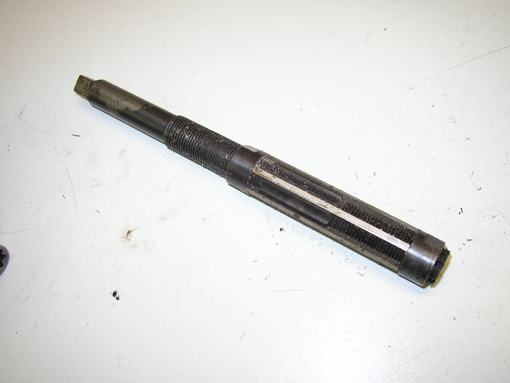 I set an old bushing in place in the lower part of the tube to keep the reamer centered and gently/carefully reamed out the upper bushing until the new pin would just sneak through. Turning the upper and lower collars on the reamer moves the blades up and down angled ramps which makes the reamer larger or smaller in diameter.
