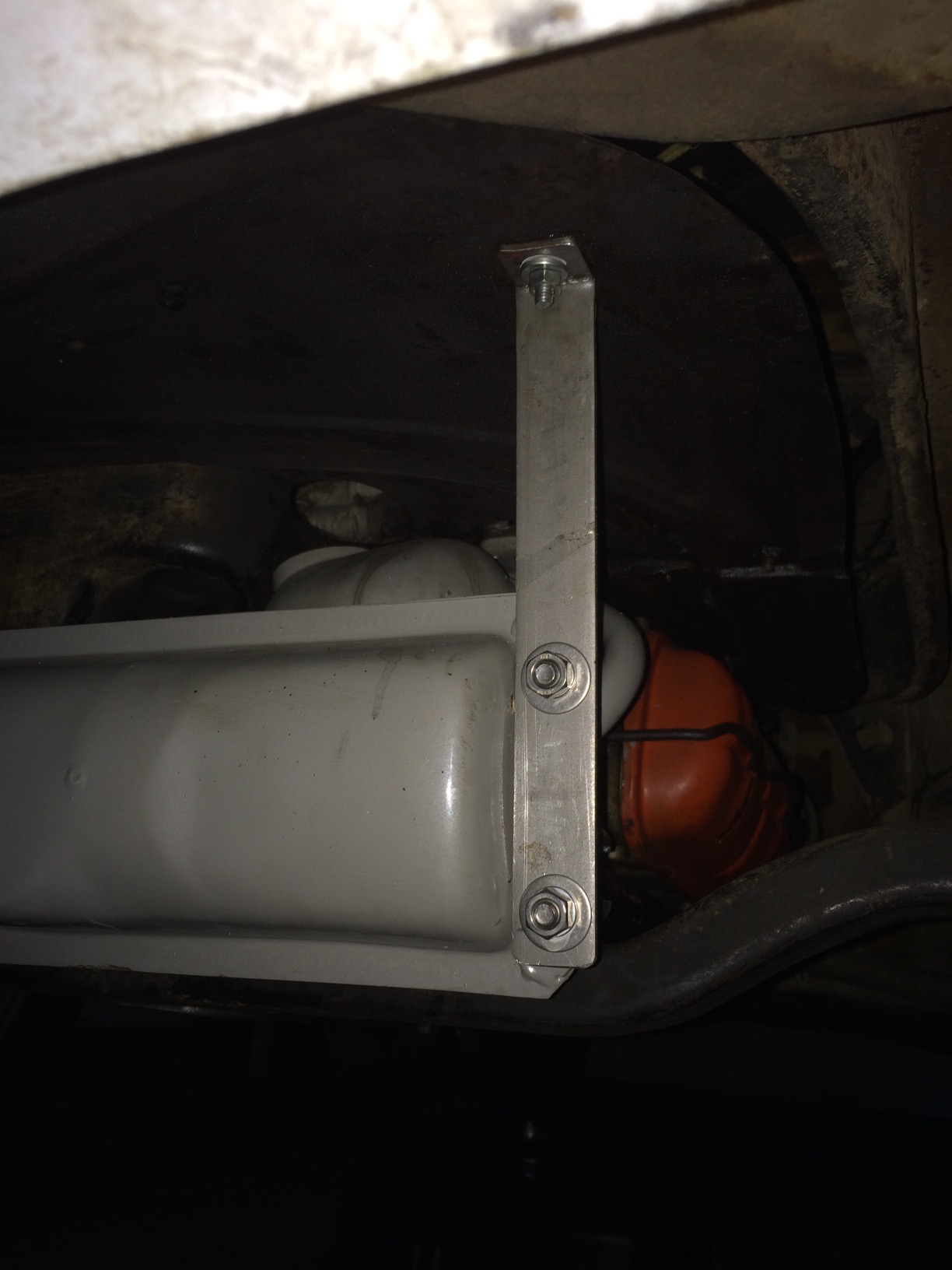 I worked on the engine this weekend, replaced the vacuum canister on the distributor, replaced and adjusted the points, replaced the spark plugs and plug wires. Replaced five of the studs for the oil drain plate. Waiting on a new metal fuel line to come in, currently it has a soft fuel line coming through the tin into the compartment. Repaired several wires to the coil, carb and alternator. Also replaced all the missing screws in the engine tin, it only had about half installed. I noticed that the large breastplate had trouble holding itself up level with the lip in the engine bay that the foam seal attaches to. At first I thought maybe the foam seal helps hold it up but that would still put a lot of stress on the tin and there is some stress cracking evident from years of flopping around. I found some additional holes that must have had brackets going to them and they lined up with the corners of the muffler. Searching online I could not find any photos online to confirm the actual existence of the brackets. At any rate I fabricated some simple brackets, used the tailpipe bracket bolt holding slots to attach them too and it seems to work well. My guess is when they made the muffler they did not reinstall the original brackets as the homemade muffler had nowhere to attach them too.