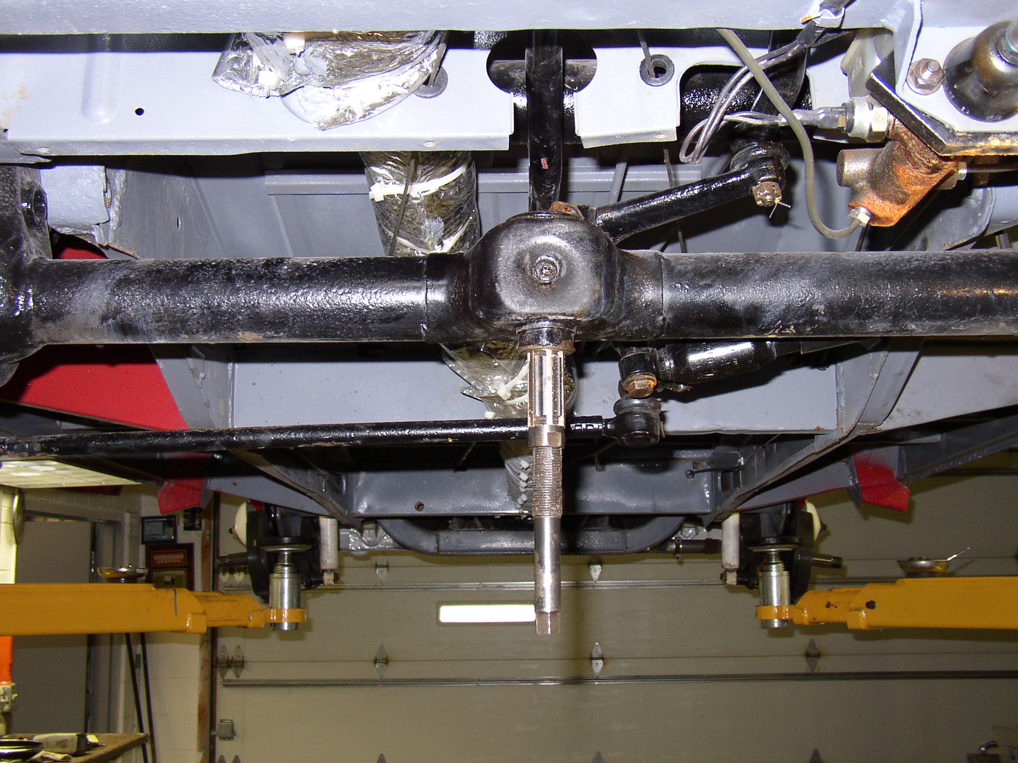 I "cheated" when I did the resto- the front end checked out as tight, so I cleaned it, painted it and figured I'd address any problems later. Well, later is here, and 3k miles proved the center pin to have a slight bit of slop in it along with one slightly sloppy tie rod end. Well, it's time to do the center pin. The Samba gang has a huge thread on this so I'll just post the details.