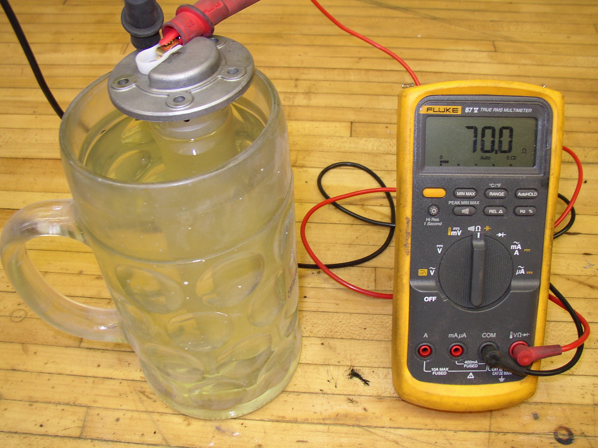 The fuel is not quite to the top of the glass here, it's reading 10.6 ohms.