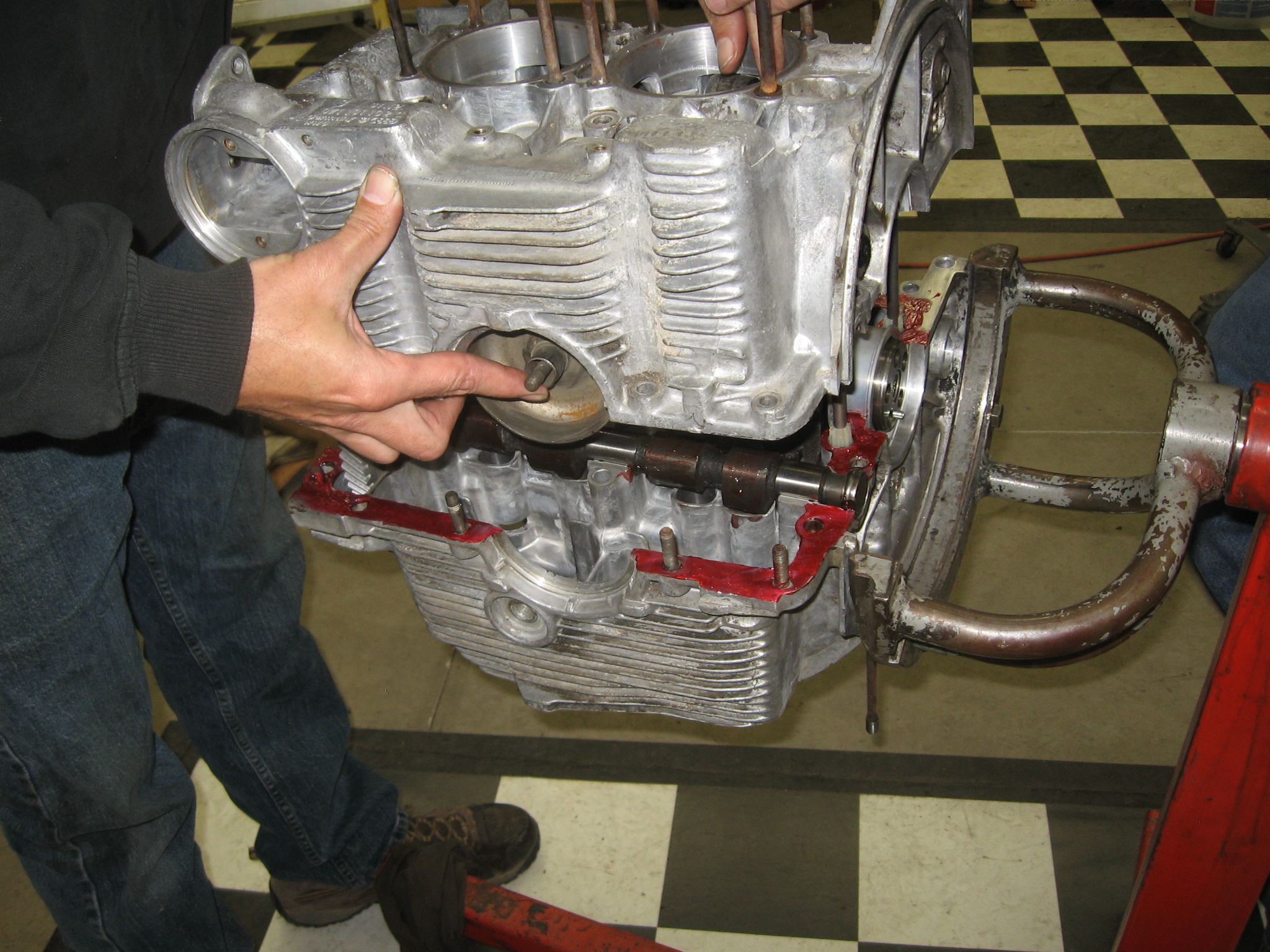 I have used several different sealers for this and they all work. I have used Locktite 518 the last several times and so does Chuck. a thin bead,then smear it with your finger. Don't forget the cam plug. concave side faces the cam on all engines except T1 auto stick. we used permatex 3H around the outside of the cam plug. Set the right case half over the studs. There are 20 case bolts on the T4 motor along with washers.Three of them are easy to overlook.1 at the bottom front in the bell housing area,1 in the deep recess on the bottom,this is the 71mm one that holds the oil pick up,and one below the oil cooler in the left case half. the 6 main ones around the crank get torqued first ,from the center out.