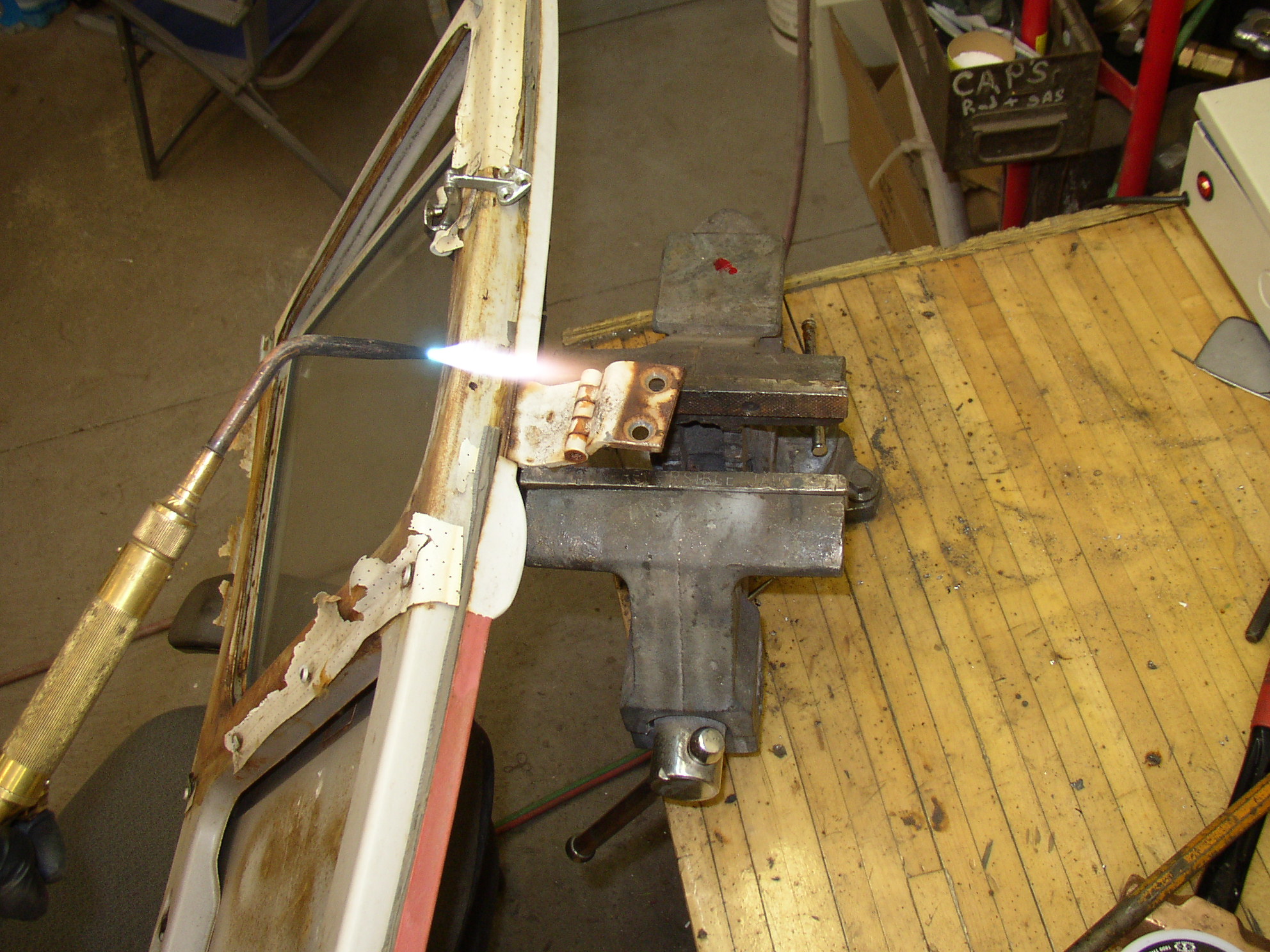 While primer was drying I figured I’d repin the cargo doors so when I adjust them and set the gaps the hinges will be new. Nothing new here, glow them, knock out the pins, drill the 6mm to ¼”, which is only a few thou bigger to compensate for wear. Don't do this without a vise- you could easily tear the hinges from the door skins.