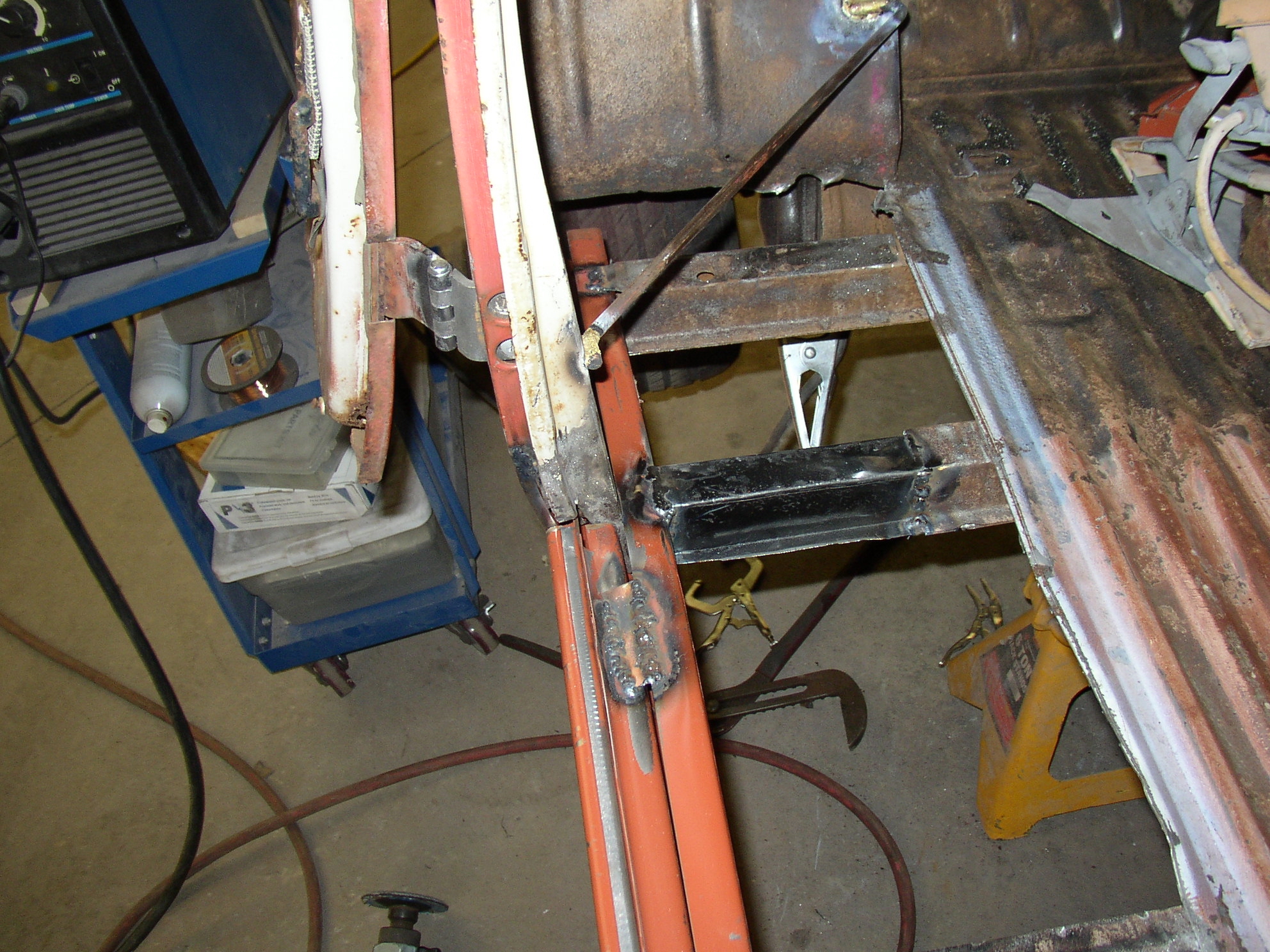 Front of bulkhead/outrigger/jack point from front wheelwell. Ugly welds but strong.