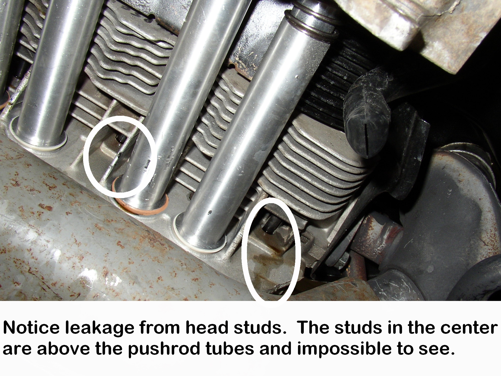 Man, this 1904 has given me a giant PITA with nuisance oil leaks. Repeated replacement of pushrod seals, fittings that didn't want to seal, head studs (like this) that leaked repeatedly, ugh. I don't think it's a crankcase pressure problem, the blowby is comparable with the 1600SP in the bus. It's just bad f'ing luck. I have dozens of hours sealing, resealing, replacing, and bitching at these leaks. That's half the reason I run it so long on the run stand, so I can work the bugs out. Usually I have 6-8 hours on the run stand, this one must have 15-20. The (desirable 36hp Beetle cast iron Bosch VJR 4 BR8) distributor was junk, too, with wicked spark scatter so I had to change that out after putting $40 worth of points/cond etc in it. The service manual says you don't have to seal the head studs (but I always have) and on this one I had to do it twice. For some reason the High Tack I've always used didn't stick to the aluminum (WTF?) and I had to redo it again with Permatex #2 which is like toothpaste. It took three times with the pushrod tubes, too, the oil pump had to come back out because it leaked, and there was an oil galley plug that took about 5 times to seal. I have NEVER had a VW (or any engine!) give me this much grief. I've been chasing oil leaks since April 12. Here the big head stud leak is circled but the center studs are also leaking and dripping onto the PRTs, almost impossible to see, and this is after using High Tack on the stud washers and nuts, and replacing the PRT seals three times. Ugh..........