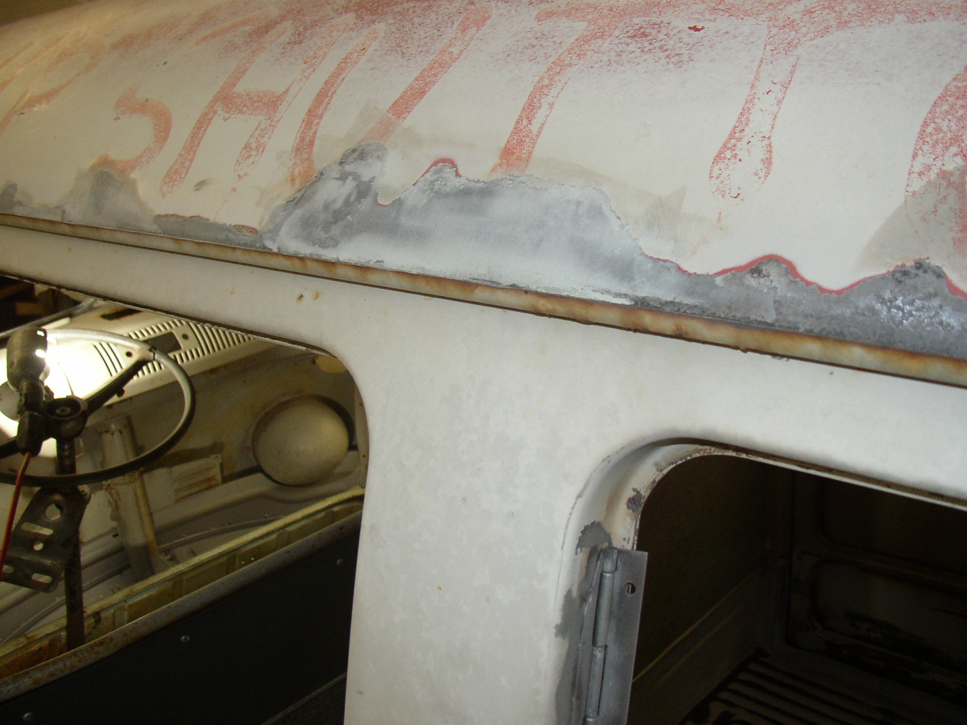 Wow, back on Bus 2 which hasn't had any love for quite some time. I sandblasted the window frames to get rid of the crust there and see how much rot there is. Luckily, very little, only a couple of pinholes, I thought I had good pictures of that but I can't find them. Here's the windshield frame after sandblasting and putting some epoxy paste on to fill the pits, pinholes, and build up the rough inner edge a bit.