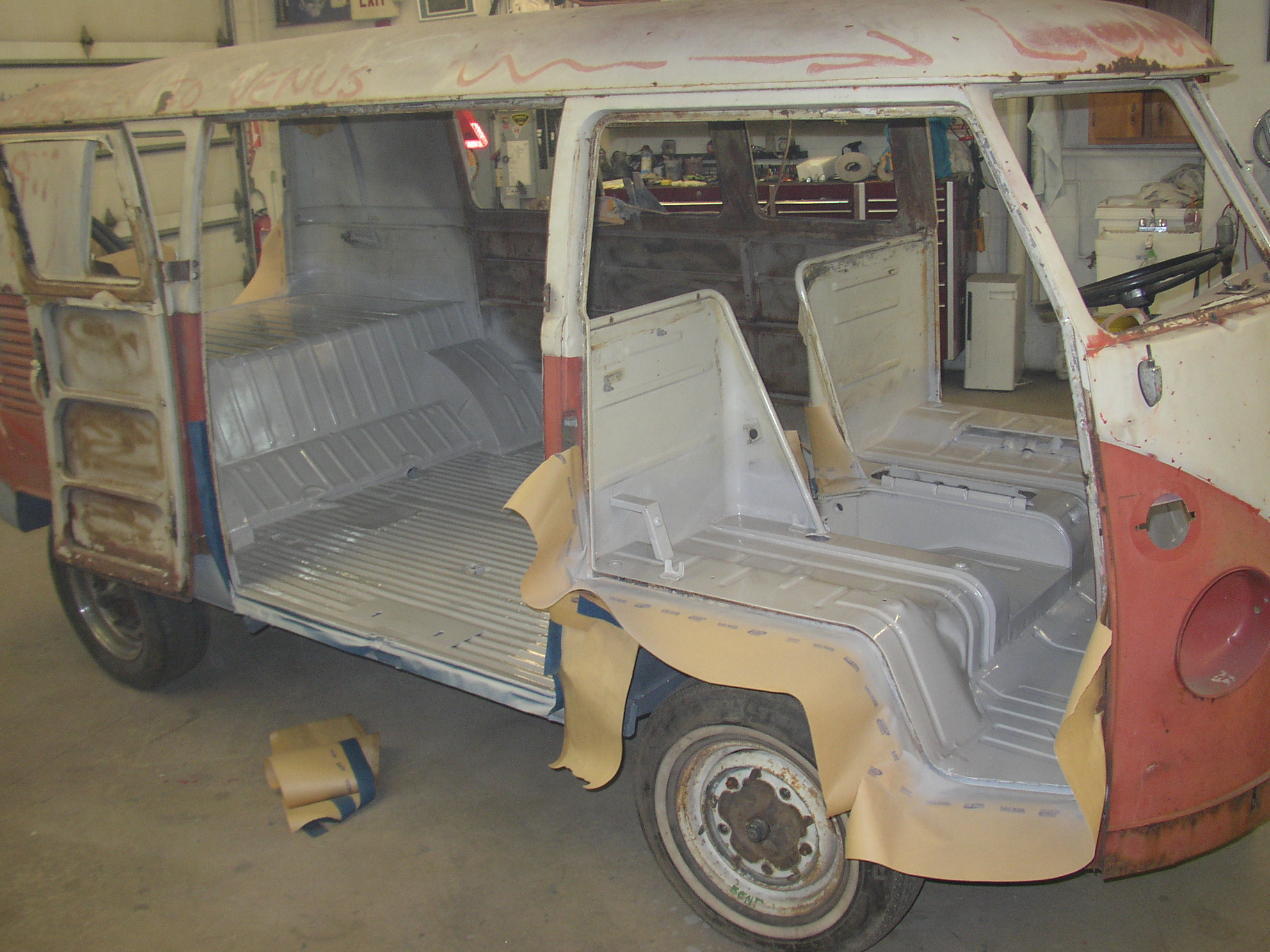 Sandblast the entire gutter and rust spots in the roof, luckily there was no rot there. :o