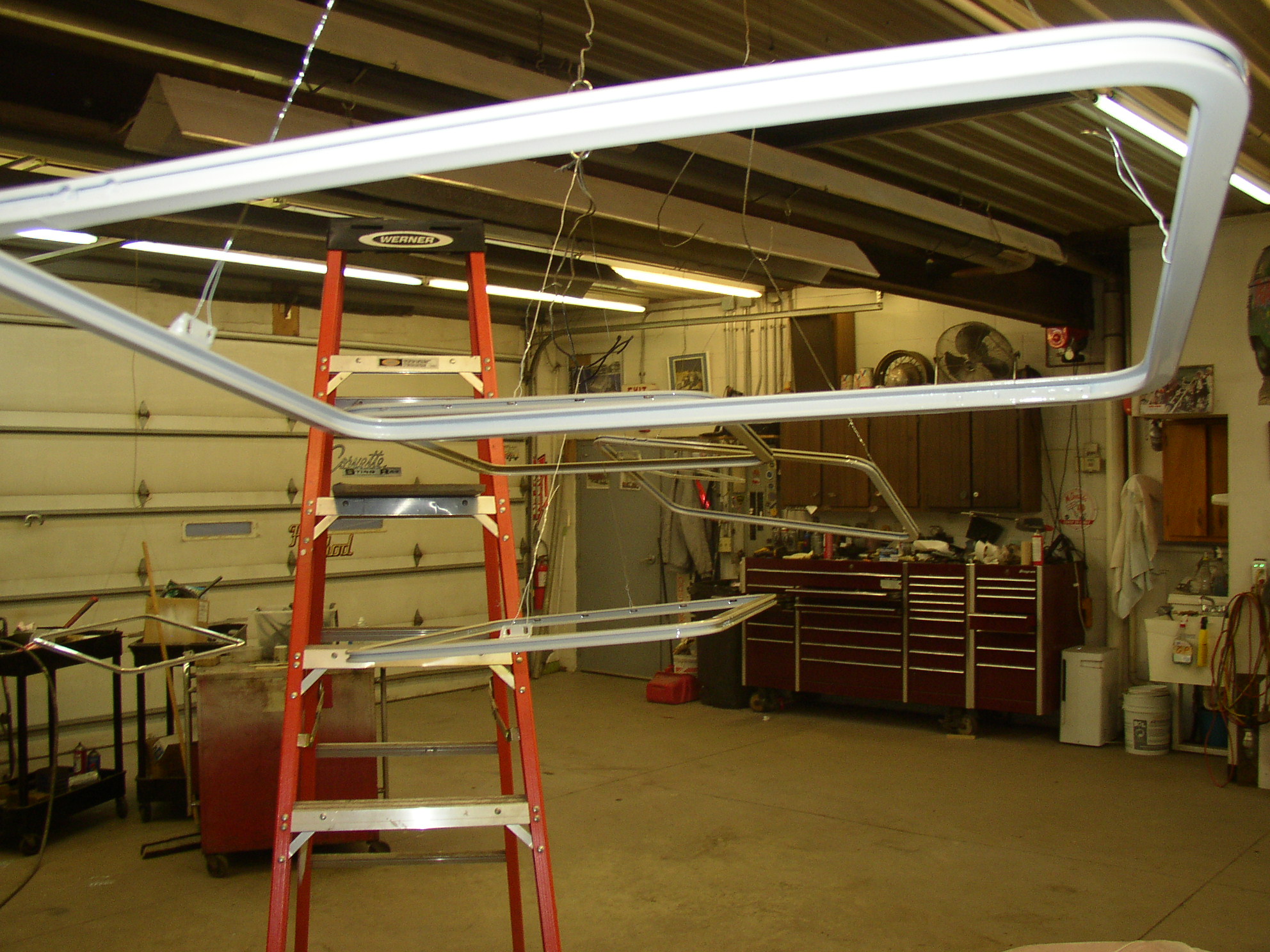 Two coats of primer and two of color, they look like an art exhibit when drying. Use a Scotchbrite pad to remove the gloss after drying thoroughly several days, this makes it blend better with the old paint. Cut the old frame from the glass. See the cardboard on the glass protecting it from sparks? Wanna know why that's there? Ask Lurch. Cut the frame twice and pull the halves off. They can be pretty stuck from age, be carefullllllllllllll...... $hit! Clean the grunge from the glass using the magic crap, razor blade, and steel wool. My glass had some etching on it from age that would not come off. This is where the problem came in- I looked up in my file where the last rubbers came from on the '66 and it was WCM. They were on backorder there so WW filled in, and the WW rubbers were MUCH harder to install than the WCM ones a few years ago. On the '66 I had a combination of OEG frames and Wolfgang frames, this time was all Wolfgang frames. It took several times as long to install the glass into the frames as using WCM rubber. I probably had 3x the time in this and had to resort to force (strap binder) when I just used my hands with the WCM rubbers. In addition the edges of the seal constantly wanted to disappear under the frame.