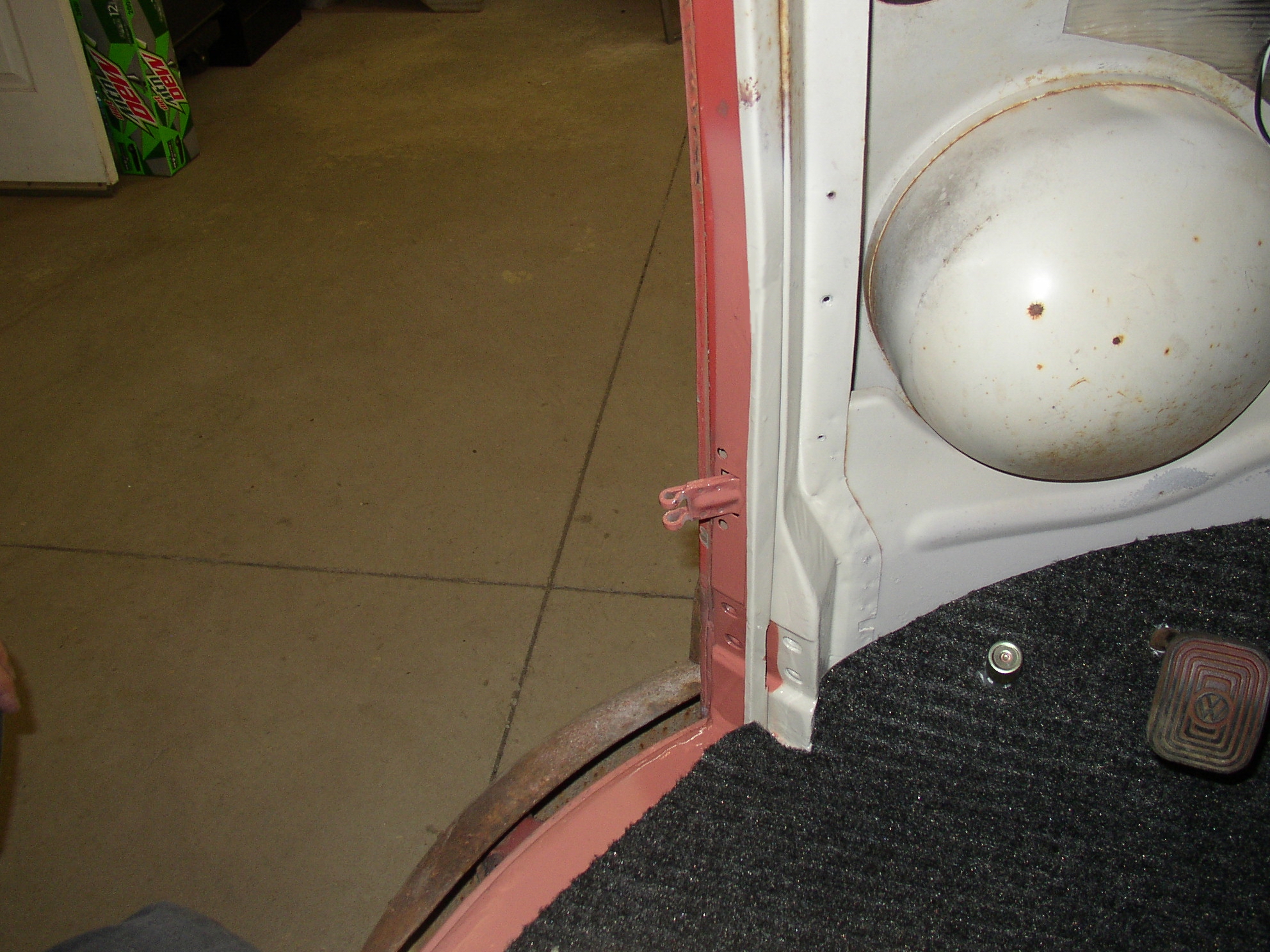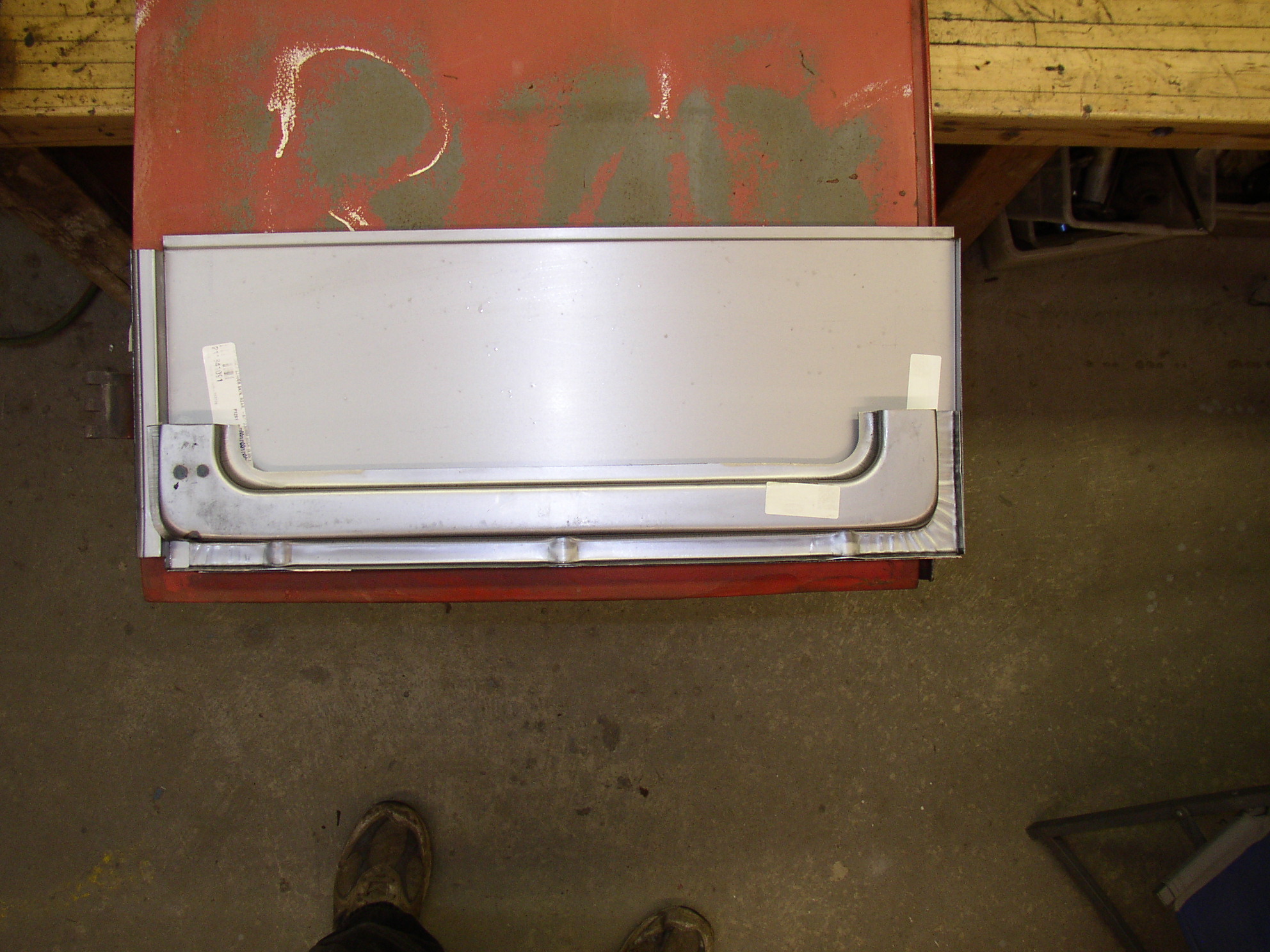 Go to put the driver's door on and realize I hadn't looked at it in nearly 2 years. I had forgotten it was hit near the handle, putting a good "V" not only in the outer skin but also the inner structure. Strip it to a bare shell, I didn't take a "before" picture, but spent an afternoon with a BFH and blocks of wood making it straight again. Even the latch was bent, but I was able to straighten it too. The outer door handle wouldn't work prior to straightening due to geometry problems, afterward it worked fine. Funny how stuff like this eats up a bunch of time, much more than you'd anticipate or estimate. Good thing I'm not doing this job on a quote or flat rate.