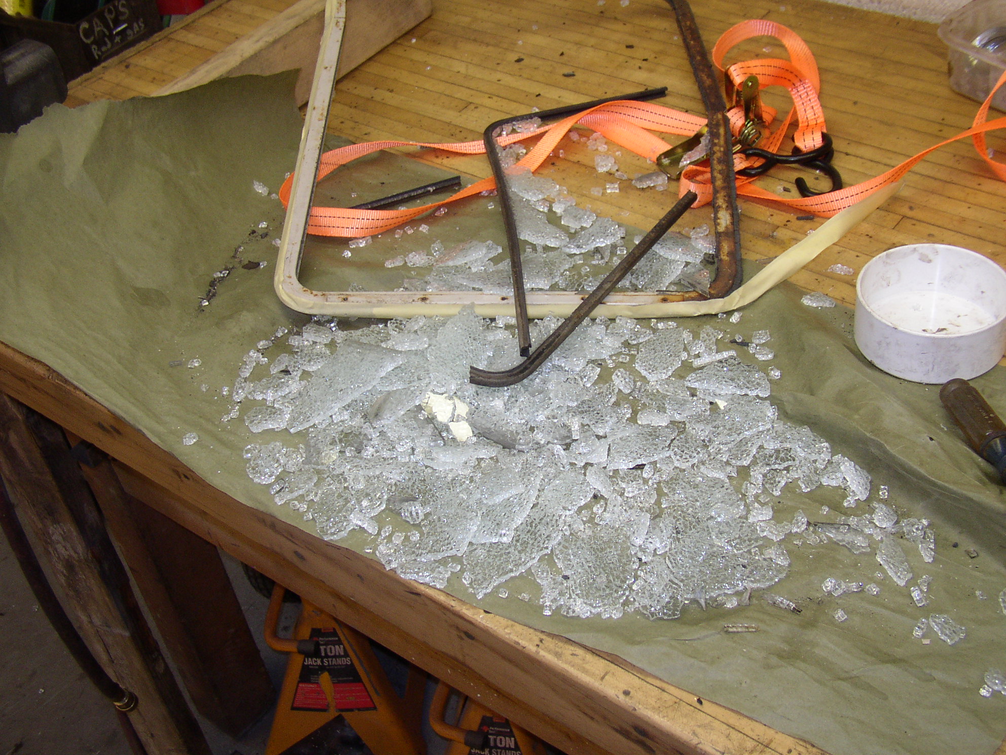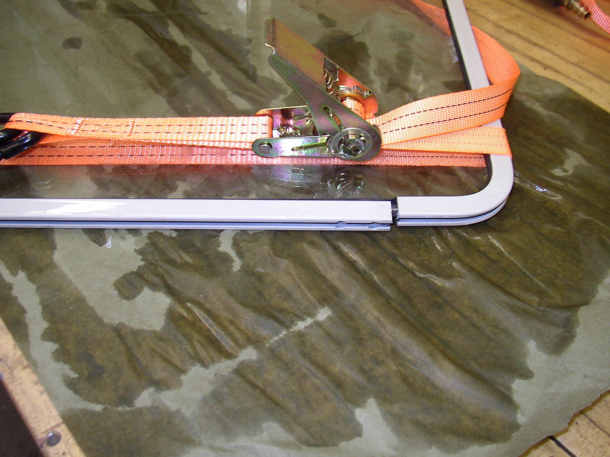Two coats of primer and two of color, they look like an art exhibit when drying. Use a Scotchbrite pad to remove the gloss after drying thoroughly several days, this makes it blend better with the old paint. Cut the old frame from the glass. See the cardboard on the glass protecting it from sparks? Wanna know why that's there? Ask Lurch. Cut the frame twice and pull the halves off. They can be pretty stuck from age, be carefullllllllllllll...... $hit! Clean the grunge from the glass using the magic crap, razor blade, and steel wool. My glass had some etching on it from age that would not come off. This is where the problem came in- I looked up in my file where the last rubbers came from on the '66 and it was WCM. They were on backorder there so WW filled in, and the WW rubbers were MUCH harder to install than the WCM ones a few years ago. On the '66 I had a combination of OEG frames and Wolfgang frames, this time was all Wolfgang frames. It took several times as long to install the glass into the frames as using WCM rubber. I probably had 3x the time in this and had to resort to force (strap binder) when I just used my hands with the WCM rubbers. In addition the edges of the seal constantly wanted to disappear under the frame.