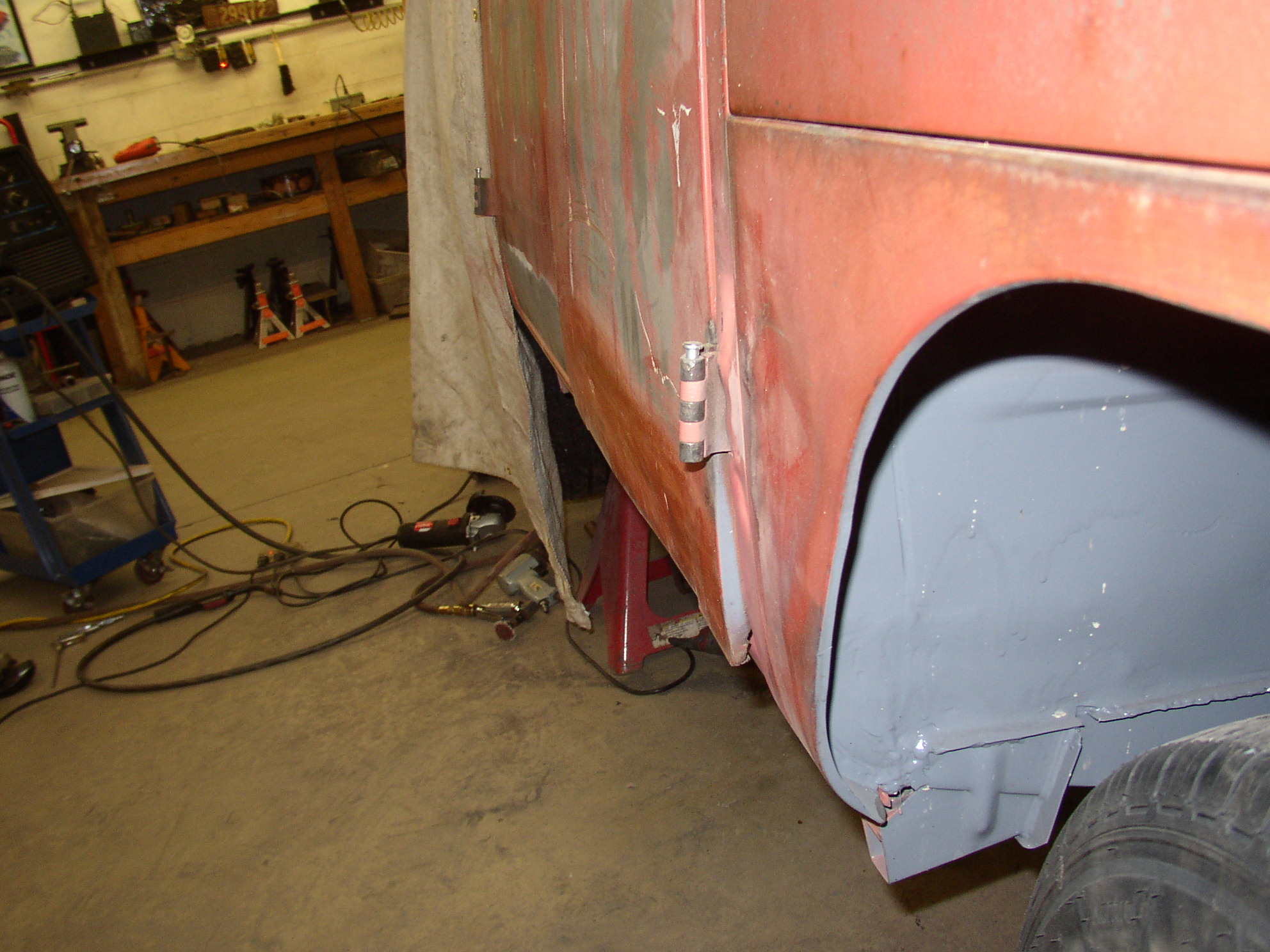 I figured it would be easier off the bus so I popped the pins and worked on a cart. More mud, then 36 grit on an air file.