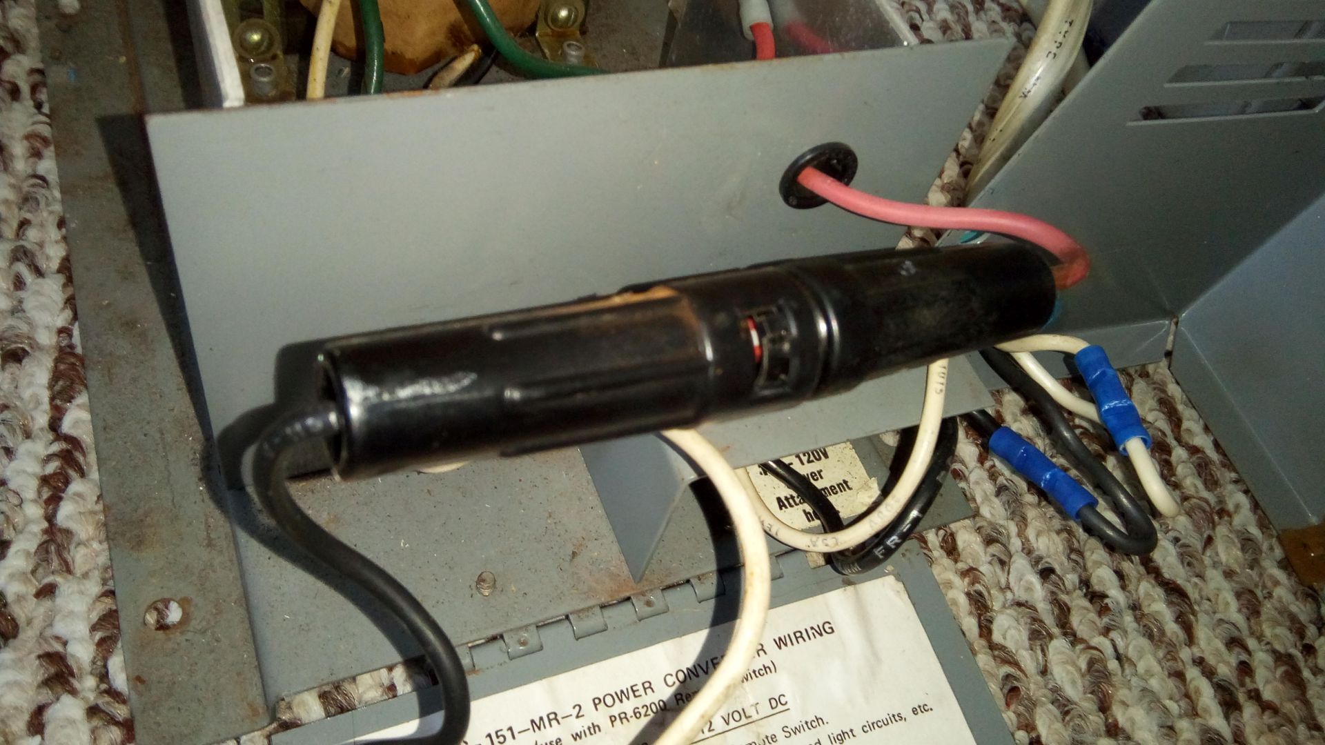 The yellow wire nuts and the electrical tape on the insulation mean that a PO messed with the unit. Removal of the bottom insulation reveals the heating element, hidden inside a tube welded to the coolant line you can see the tip of it inside the tube; admire the ghetto clamping screw! The heating element slides out easily; the first problem is that there are four wires coming out of it, instead of two Notice the stamping for both 12v and 115v, which means that it belonged to a canadian model - with separate circuits for battery and shore power. Next I removed the fabric insulation to expose the entire length of the wires, so I can separate the 12v pair from the 112v pair. I assumed that the 12v pair was the one initially hooked to the blue and black wires on the socket; I actually lucked out on it.Testing is easy - just hook up the wire pair to the battery terminal - I don't think polarity matters the element started immediately, and was piping hot within 20 seconds So the heating element is good!
