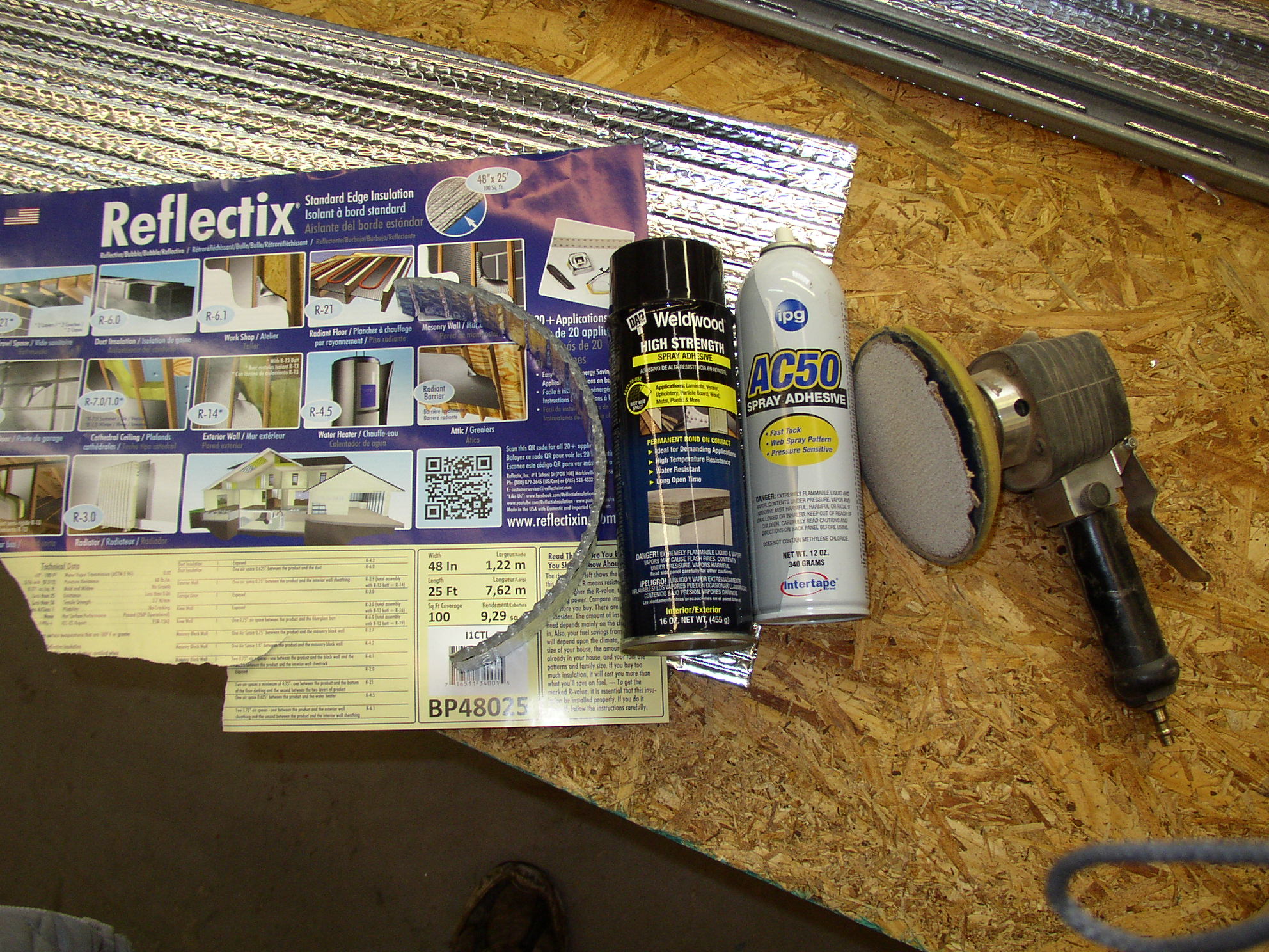 Next is doing something with the interior surfaces. First is taking a D/A with 80 grit and going over the whole inside to remove old glue. (see above pic) Then I used spray glue and Nasa bubblewrap insulation from Home Depot on all inside flat surfaces to reduce noise and hold the heat in. I like the spray glue with the "figure 8" pattern over the regular fan spray. This will also reduce/eliminate condensation from your breath on the roof which will form in cold weather. The problem is now it reflects EVERYTHING and makes you feel like you're in the chicken rotisserie at CFM when you're inside. But it's quiet.