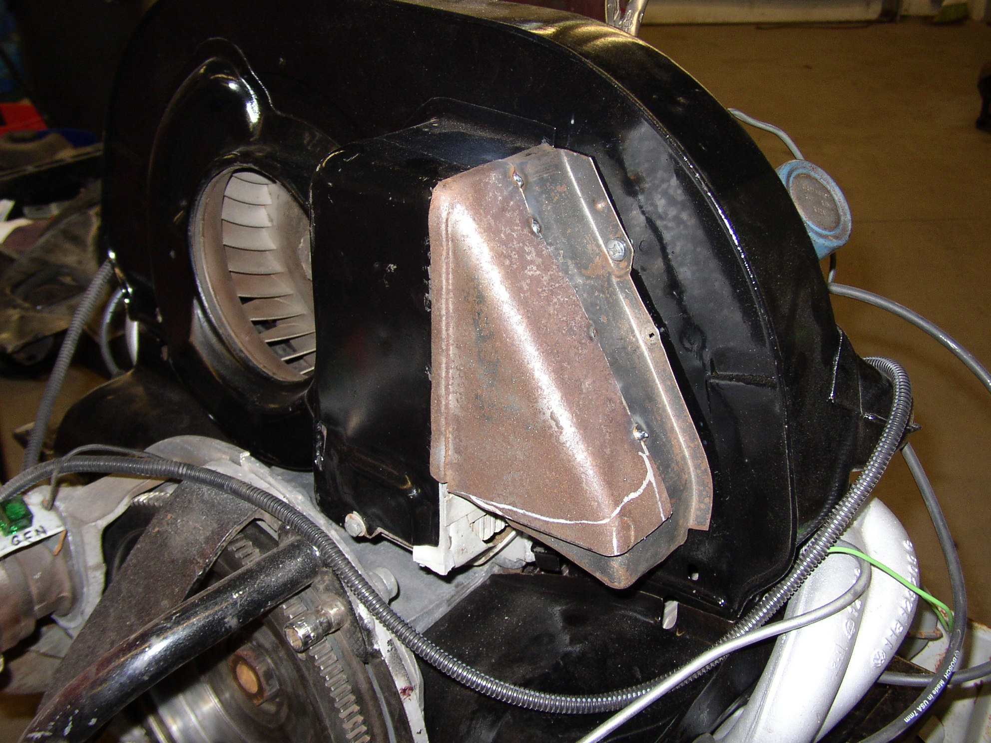 By all outside indicators, this looks like a really nice virgin low mileage engine. Throttle shaft is tight in the carb, almost all original components, nice end play and no vertical movement in the flywheel. Good compression (135-145) across all 4, runs good with no noises and starts right up. I have high hopes for this as a spare engine. I bought it at a garage sale from a widow whose husband was going to build a kit car but died first. I'm thinking I got lucky on this one. Fan hub was broken, no big deal. '74 AH case. Strip it down to retrim it to a generator setup and make sure the fins are clean. Cut the EGR flange off the intake manifold. Run a 3/8" tap into the hole, bottom a 3/8" bolt into it, cut it flush with a whizzer and grind it smooth. I don't know how you guys get stuck gen pulleys off but here's how I do it- weld a homemade puller onto the pulley and burp it loose. You can cut the puller from the pulley and re-use it with a bit of grinding, that surface is not used when in operation. Here's something bizarre when it was on the run stand- the bellhousing adapter is bolted tight but not grounded! Ted would call this a voltage drop of 12v when it should be under .1v