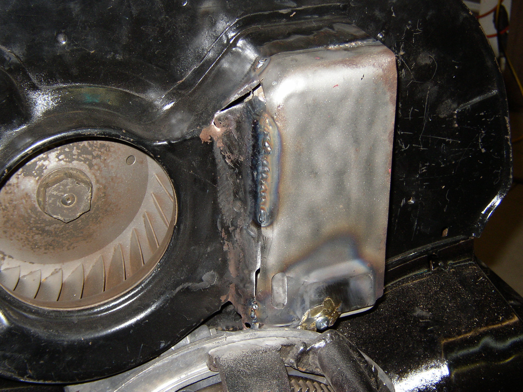 By all outside indicators, this looks like a really nice virgin low mileage engine. Throttle shaft is tight in the carb, almost all original components, nice end play and no vertical movement in the flywheel. Good compression (135-145) across all 4, runs good with no noises and starts right up. I have high hopes for this as a spare engine. I bought it at a garage sale from a widow whose husband was going to build a kit car but died first. I'm thinking I got lucky on this one. Fan hub was broken, no big deal. '74 AH case. Strip it down to retrim it to a generator setup and make sure the fins are clean. Cut the EGR flange off the intake manifold. Run a 3/8" tap into the hole, bottom a 3/8" bolt into it, cut it flush with a whizzer and grind it smooth. I don't know how you guys get stuck gen pulleys off but here's how I do it- weld a homemade puller onto the pulley and burp it loose. You can cut the puller from the pulley and re-use it with a bit of grinding, that surface is not used when in operation. Here's something bizarre when it was on the run stand- the bellhousing adapter is bolted tight but not grounded! Ted would call this a voltage drop of 12v when it should be under .1v