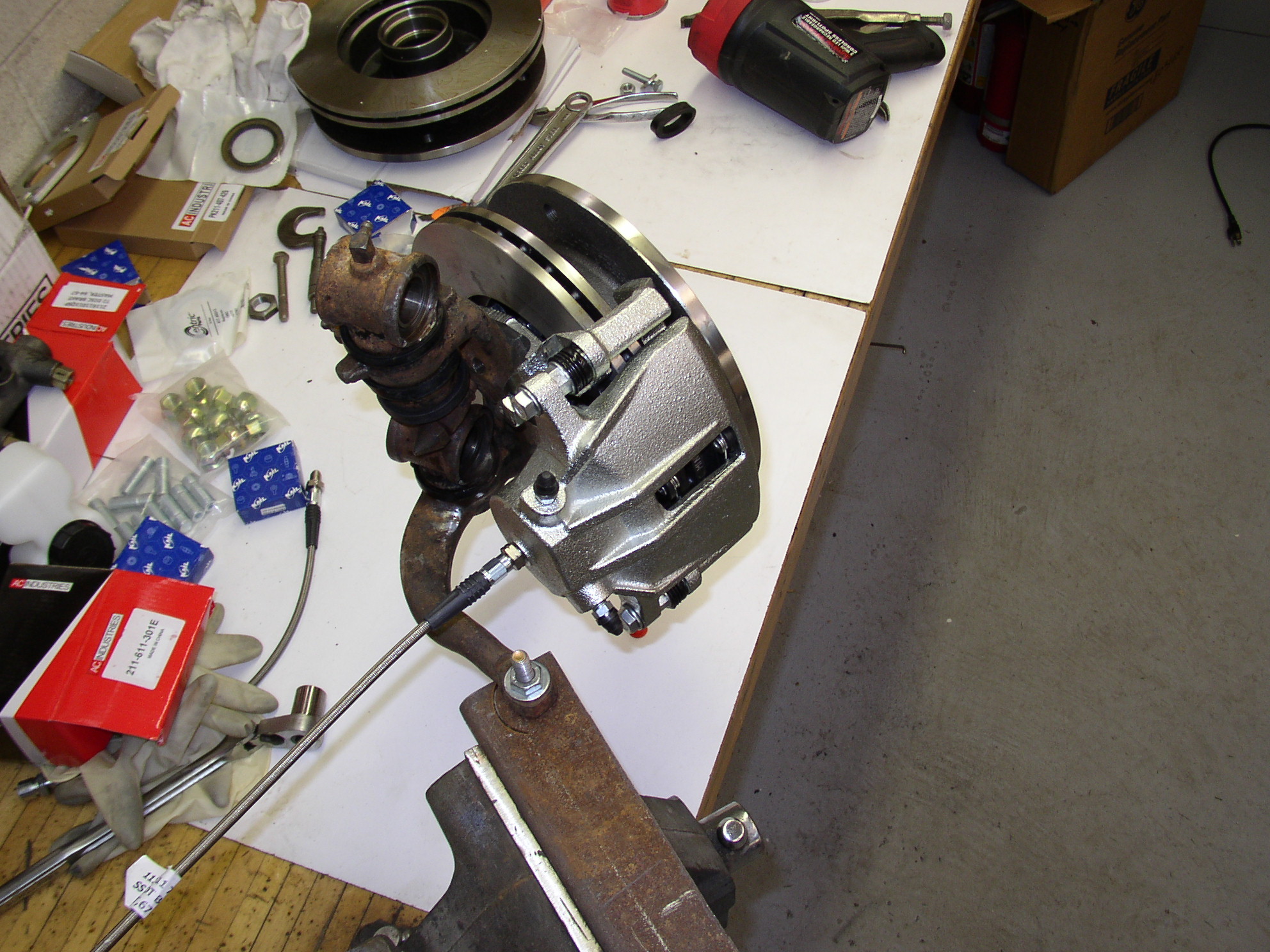 The rotors are very heavy (good), fully ventilated. They are one piece, not separate rotor/hub. I knock the races in. I had some spare spindles and wanted to mock them up on the bench before tearing my bus apart, so start by cleaning the flanges and threads: Bolt the caliper mounting bracket on (both adapters and calipers are L/R) Using the supplied gr 10.9 bolts and lockwashers.