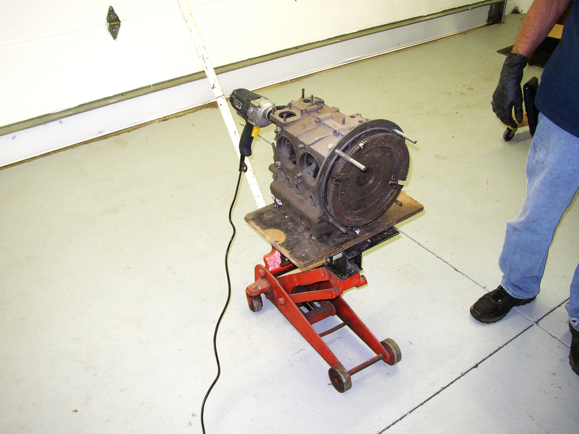 Using a low speed 1/2" drill slowly insert it into the bellhousing. The drill does have a left side handle which doesn't show in the pictures. I told Ken his job was to watch and take me to the hospital if things went wrong. :shock: