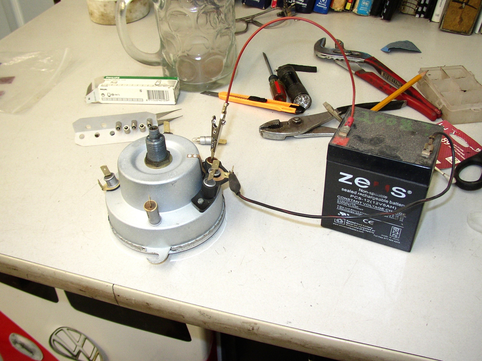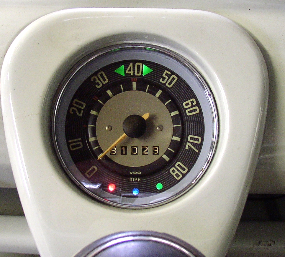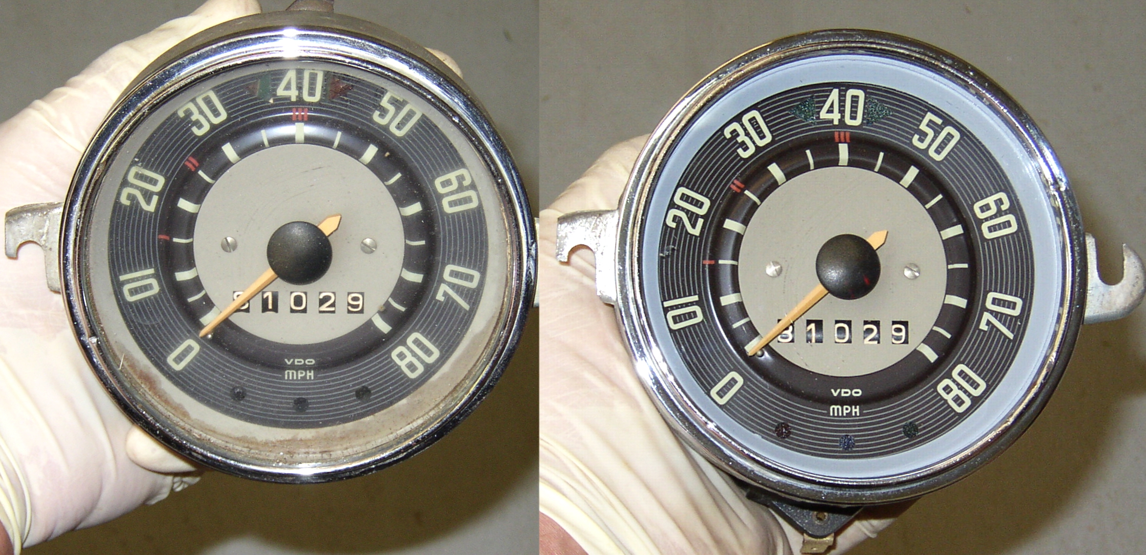 FNG wire wheeling, bead blasting, and painting parts. It's hard to find good help these days, the last FNG only lasted a couple of weeks. FNG assembling the headlight buckets. Pretty much all parts are dedicated left or right so make sure you keep them straight and mark them top and bottom to make it easier to assemble. Heat any grommets to make them more pliable to install. Meanwhile I was doing the speedo head, when I took it apart the colored gels fell out, which is pretty much normal. I bead blasted the can, buffed the chrome trim ring, cleaned things up and glued in new gels with weatherstrip adhesive. I had the FNG bead blast all of the sockets and put in new 12v bulbs. I always test them for about 30 seconds each to make sure the bulbs are good and everything is super. Here's a before and after picture. After installation with the power on.
