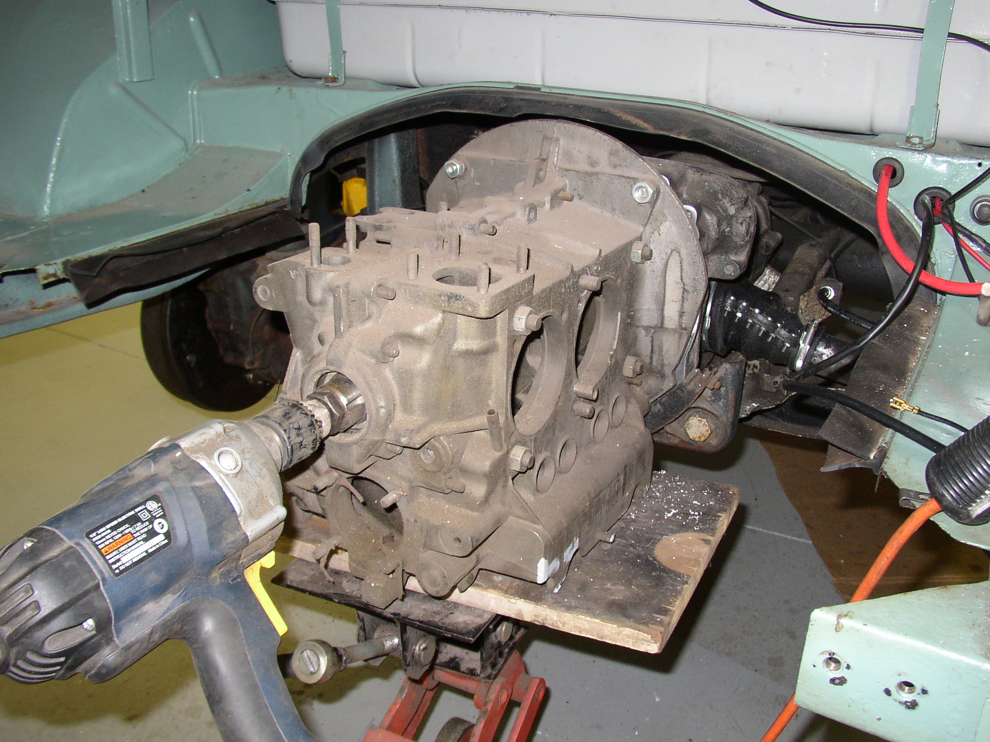 Using a low speed 1/2" drill slowly insert it into the bellhousing. The drill does have a left side handle which doesn't show in the pictures. I told Ken his job was to watch and take me to the hospital if things went wrong.