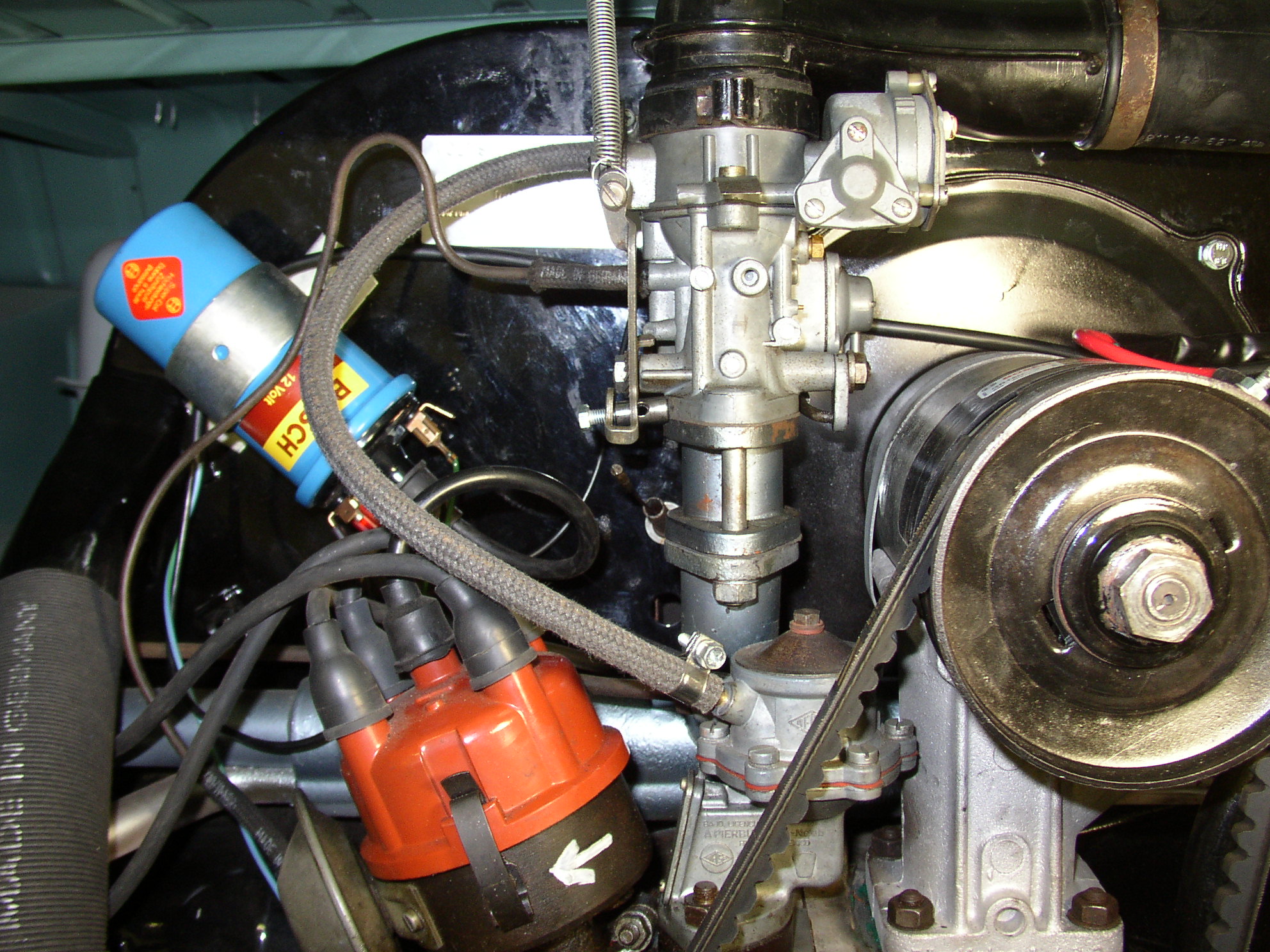 Here's the starter area detailed with Polyloom to protect the wiring. I've been epoxying a wire clamp to the tray so I have a place to put a ty-wrap, I don't like the harness laying on the heater box which is what happens after it warms up. You can't use a sheetmetal screw here as the fuel tank is just above it, ask me how I know that.