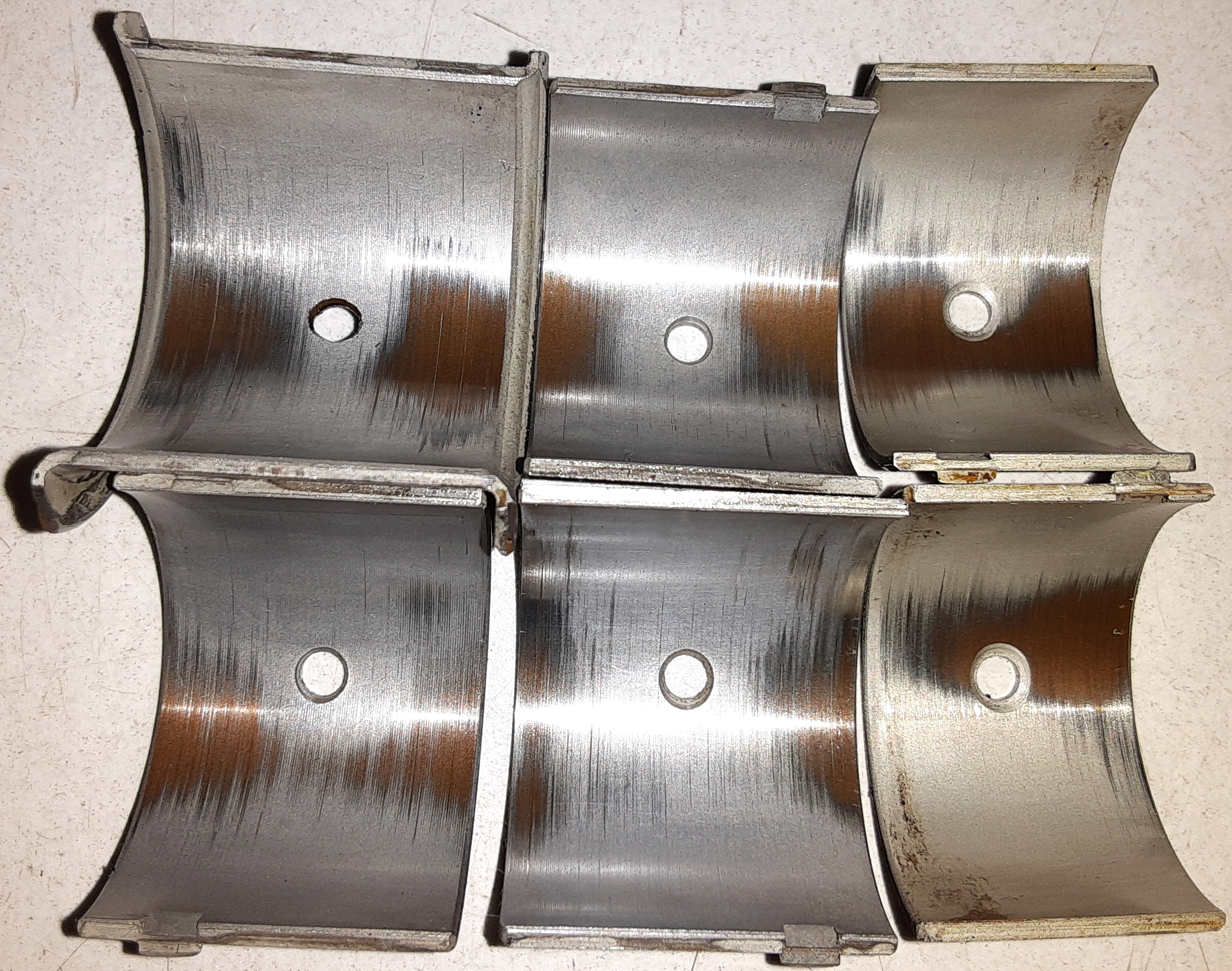I checked the mains and rods and they look like new but they're Kolbenschmidt bearings. Unfortunately they're not easy to find so it got Silverline cam bearings which show some wear. I'm not sure if this is from low quality bearings or the journal surface on the cam was not perfect but it's not a big deal. I'll replace them and polish the new cam journals with 1000-2000 grit to a mirror surface.