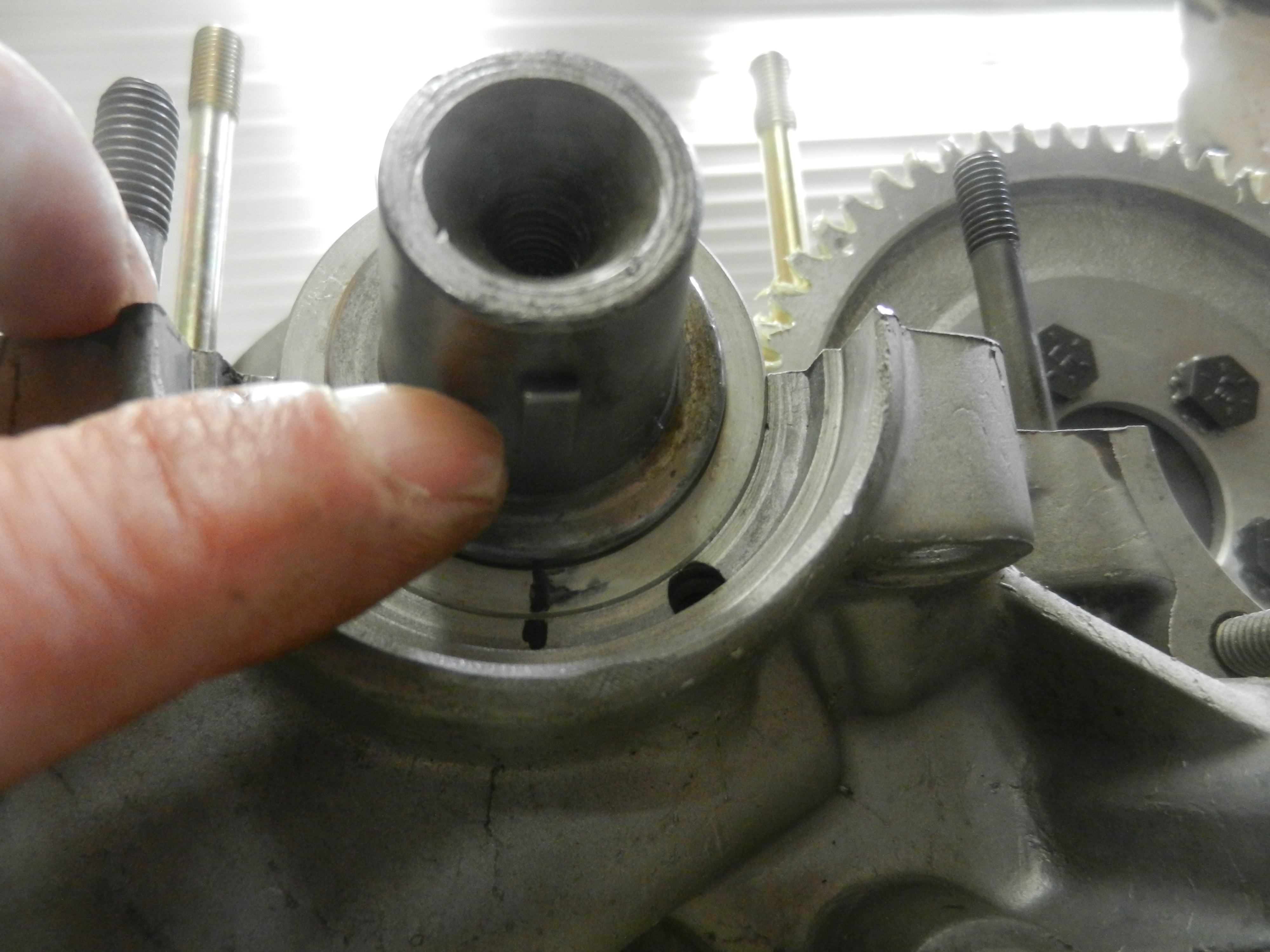 One more thing to check. The oil pump. Type 4 oil pumps are no longer available. They have 24mm gears. I won't waste any time explaining disassembly and inspection. Don't use it. It is between 37 and 47 years old and probably 100,000 plus miles on it. And there will be a clearance issue with the bolts on cam gear.