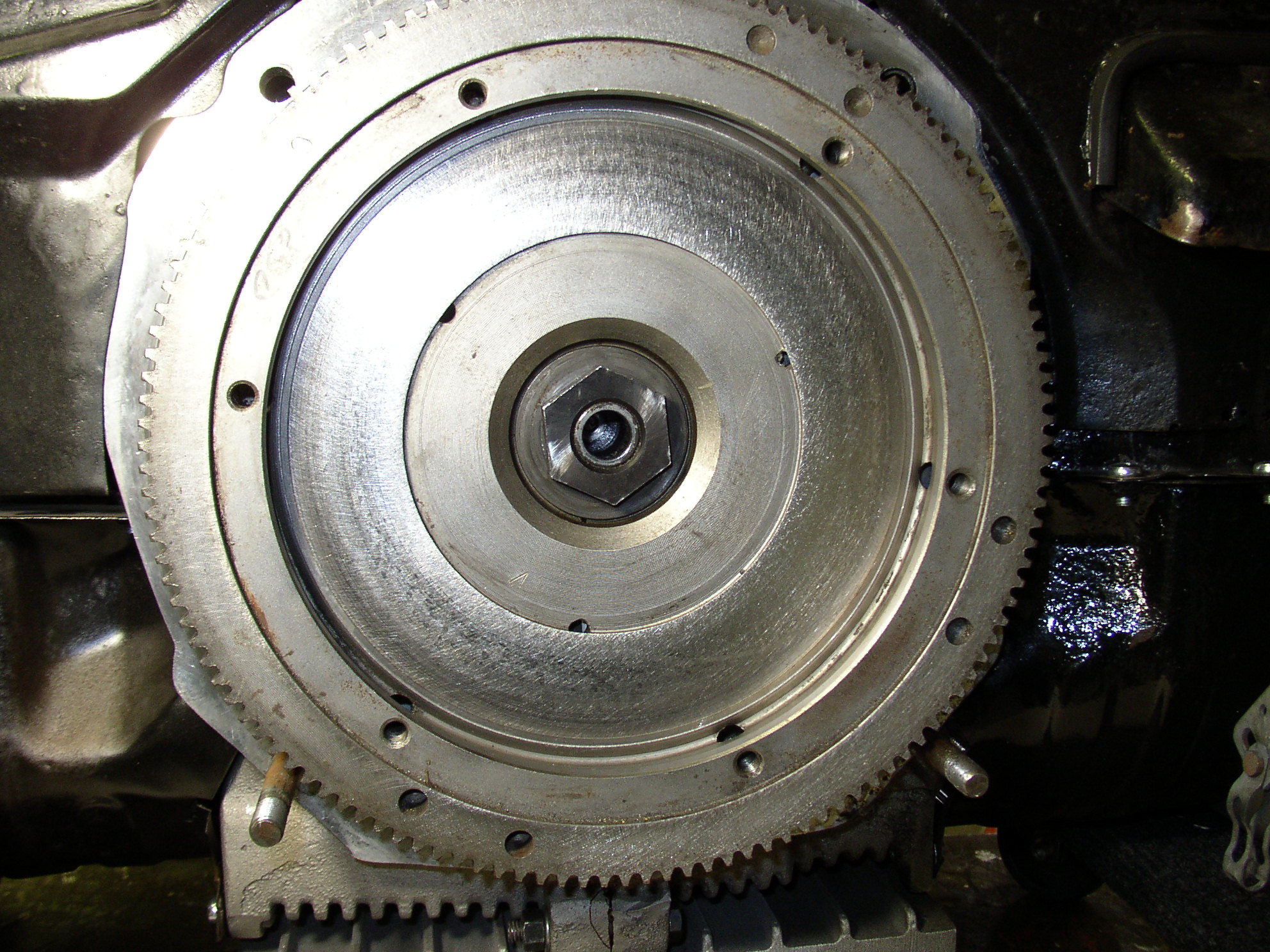 Back out it comes. From prior experience 90% of the time you have chatter the problem is the disc, I have a new spring hub disc in stock so I figured I'd try that. For S&G I checked runout of the FW, it's .000" with .005" end play in the crank.