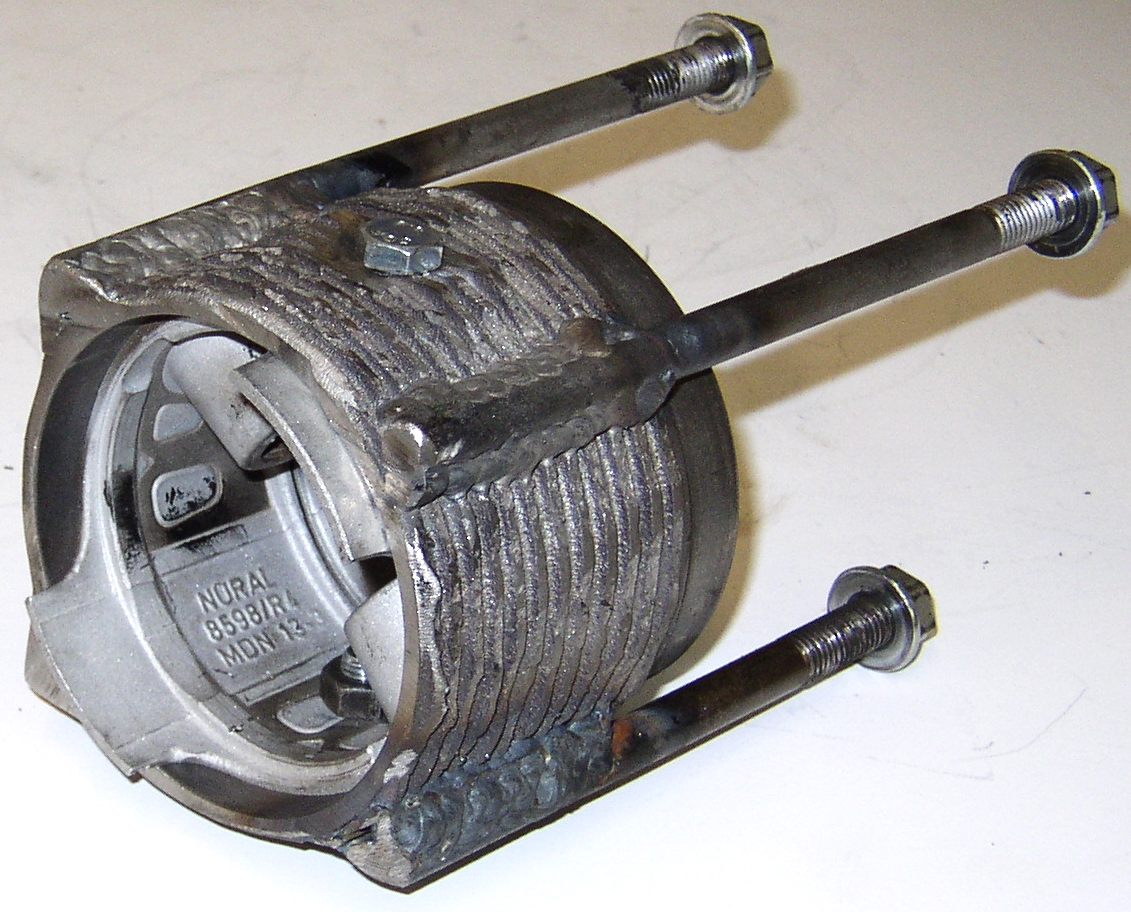 Take an old jug, knock the fins off of it with an air hammer, weld some head studs to it, bolt a piston in with a ring, seal it with RTV, and voila! I have a hillbilly test jig to make sure the valves seat. The welds aren't as bad as they look, and if you can't weld good, weld a lot.