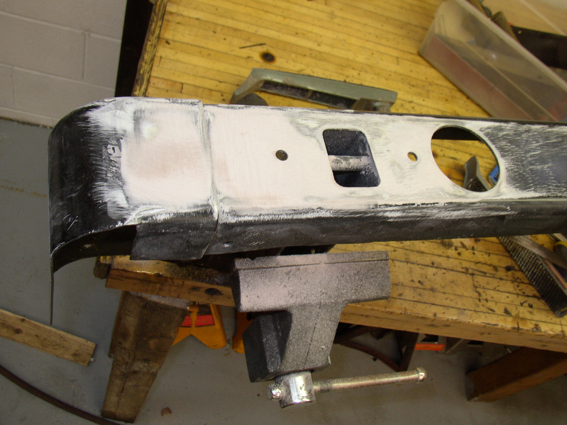 The PO painted the car but did a shitty job on the bumpers. Between that and damage from shipping they needed to be removed, straightened and painted. The damage was weird- not impact damage but "pulling" damage from either being dragged around the bodyshop/museum or loaded onto the car carrier with a strap. Anyway I straightened them as good as could be. I still have giant C-clamps from my truck days, those aren't Chinese cheapies but forged-in-USA clamps. I bet they're $200 each these days or more. I used a piece of 6" I beam for a jig.
