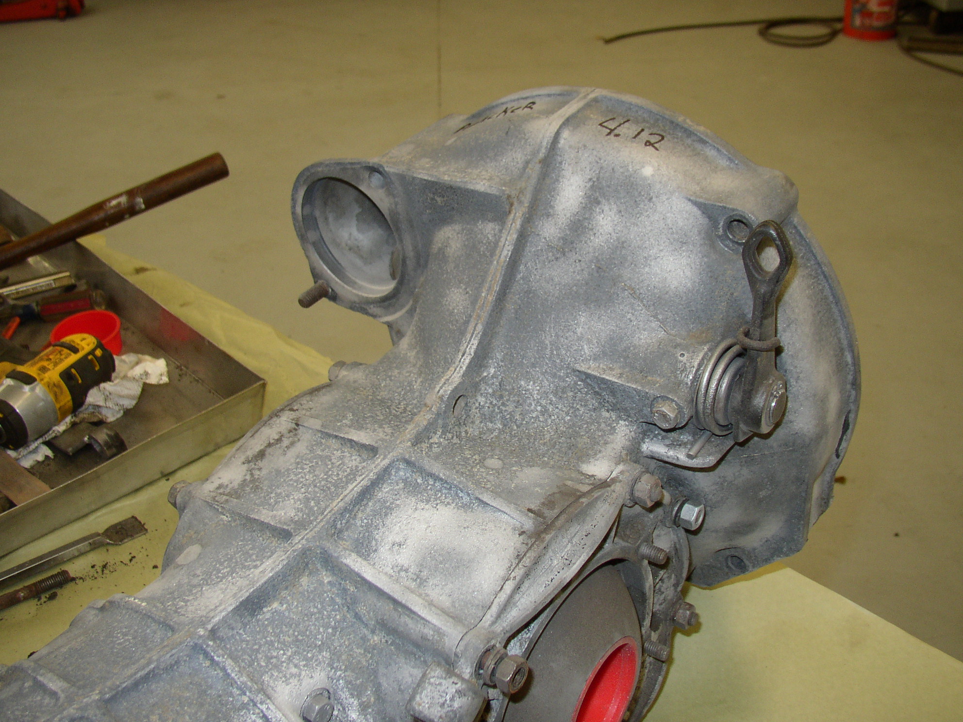 The tranny is a bit tired in Bus 2 and it probably deserves a new one. It actually works pretty well but leaks from the gearcase. I dug through my junk cores to find a suitable unit with the right R&P, I don't even remember where this one came from, probably a swap meet. I popped the side cover to verify ratio, it's 33/8 which is what I want, 4.125. Several others were 35/8 which is 4.37, a good city gear but really screams on the highway, and with the 1904 I should use the taller gear. I'm pretty sure it has a 4.12 in it right now and I definitely don't want to go lower.
