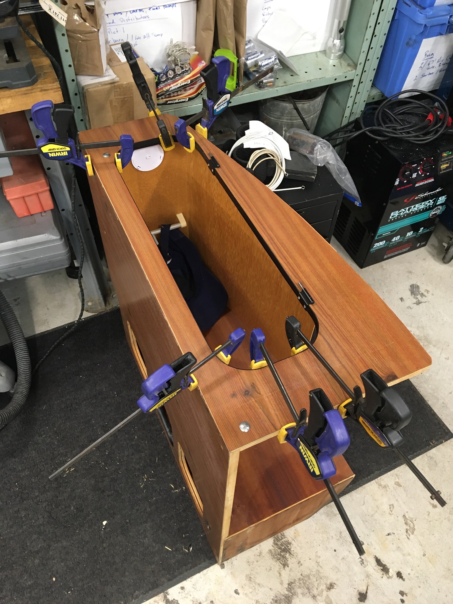While the cabinets were out I thought I should repair all the loose laminate and trim. Some contact cement and a lot of clamps.