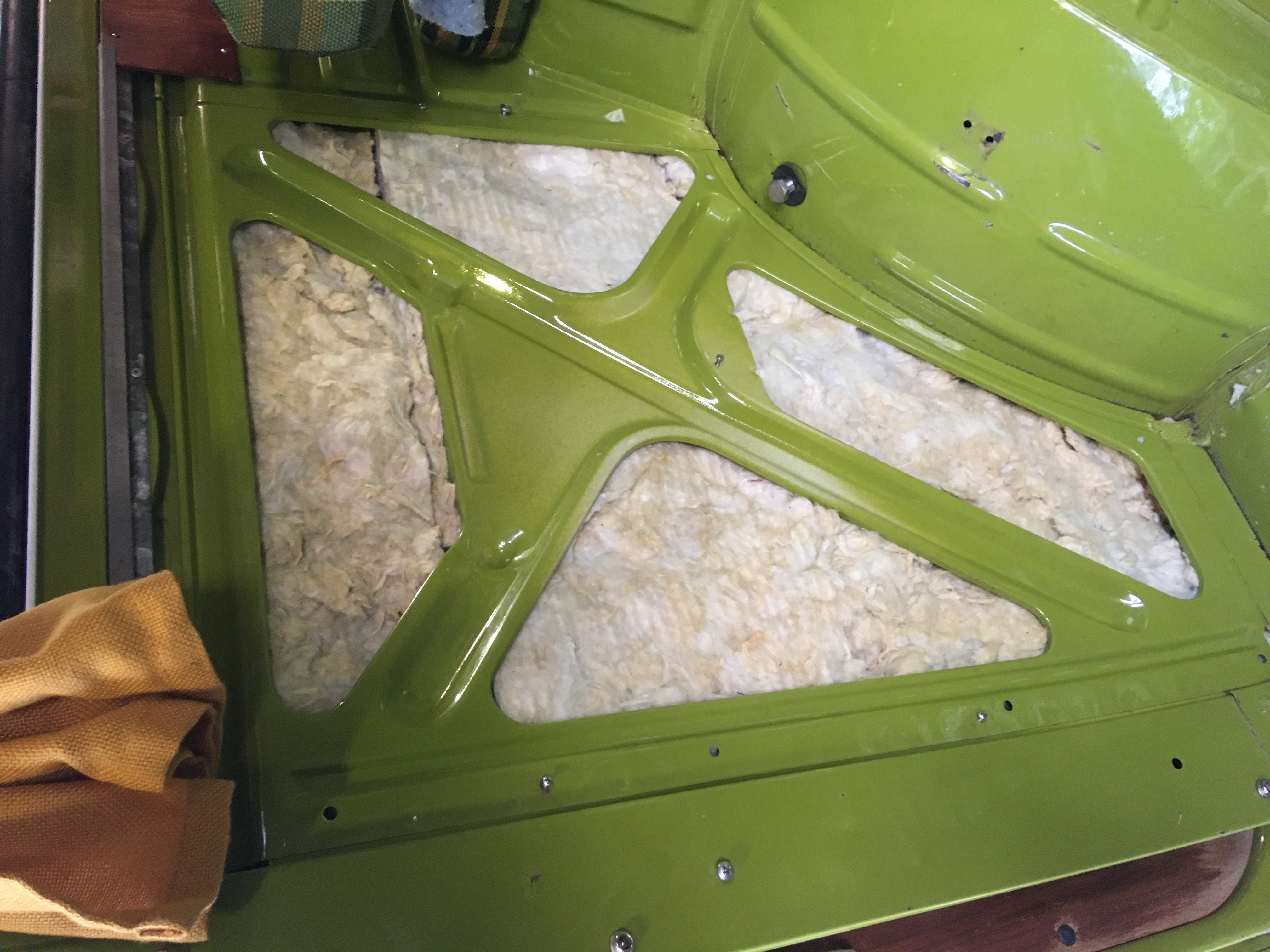 I was able to reuse the original underlayment. Treated the screw holes in the storage floor deck by scrubbing with a wire brush and then applied metal prep and finally two coats of POR 15. The original screws that held down the underlayment had seen better days so I decided to replace them with stainless steel ones that were slightly bigger. It looked like the originals were 4”s x 3/4 inch, or the German equivalent, and I went with 6”s x 3/4. Took my time lining up the holes in the underlayment by using an ice pick, that way I didn’t have to make any new holes.