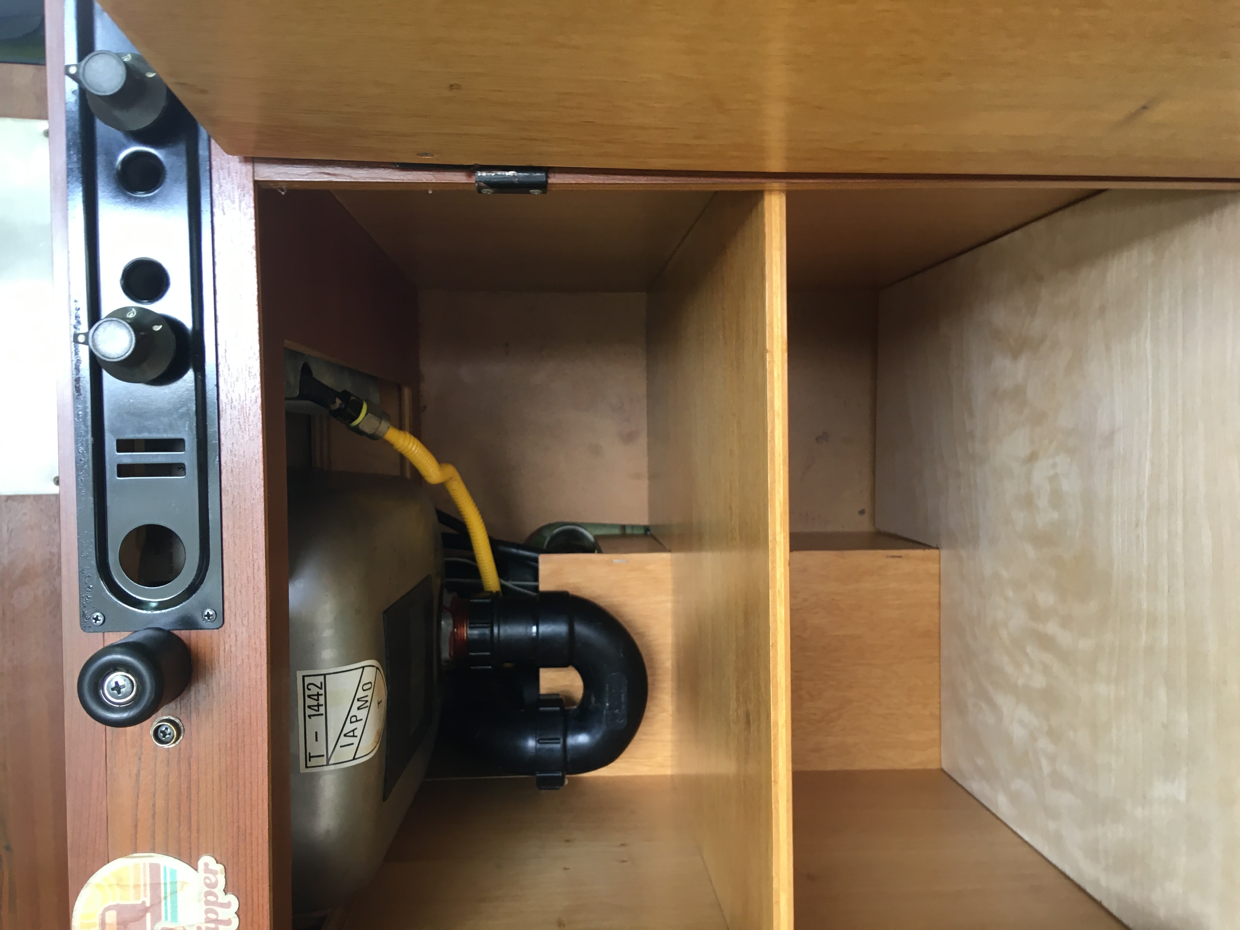 Put the main cabinet back in and replaced the main gas line while I had it out. Was able to get it at Home Depot. The original had 3/8 connectors as was 48” long. Most everyone else only had the 1/2 connectors. Resealed with the yellow Teflon tape and checked for leaks. No bubbles! Also cleaned and varnished the inside of the cabinets. Made a new shelf, one of the ordinal was pretty stained and beat up and made a new very thin bottom panel to cover the stains. I did RE varnish the entire inside including Masonite panel front and back. Also sanded varnished the underneath of the cabinet, no pictures of that. All this should give it some resistance to water.