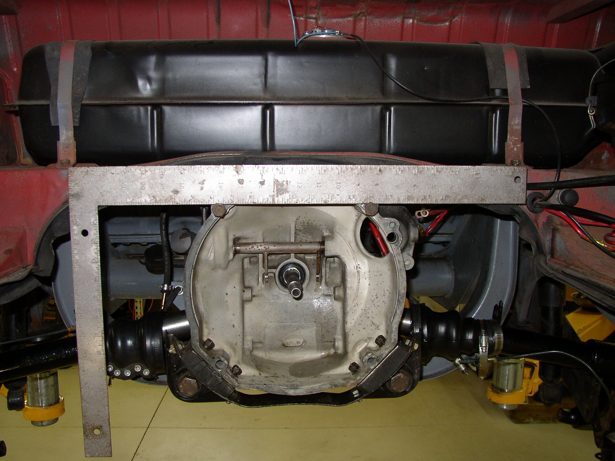 Stuff it in and start all of the bolts. Tighten these tight, than back them off a full turn. Torque these to spec. Tighten these. These are the ones that have play in them, the holes are slotted from the factory. If you don't pay attention and just bolt it together it's likely to be off level. Put two RGB bolts into the upper bell holes and lay a straightedge or level across them. Compare the top of my straightedge with the fuel tank mounting bosses, it's pretty close.