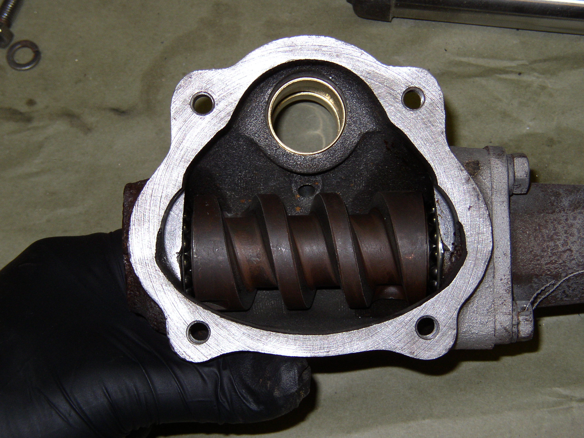 The pitman shaft bushings were worn so I replaced those, it can be done with the column in the bus. Pretty simple, actually, knock out the old bushings and knock in the new ones, ream them with an adjustable reamer, and install a new seal. You'd think it should be metric but the shaft diameter is .998". (There are two different boxes, this one is ATE/Ross) I used grade 00 grease from TSC for lube, it comes in a gear oil bottle. It's much thicker than gear oil but thinner than chassis grease and made for corn heads and other farm equipment. The yellow bushings are the new ones. No gasket on the cover, just sealer like an engine case.