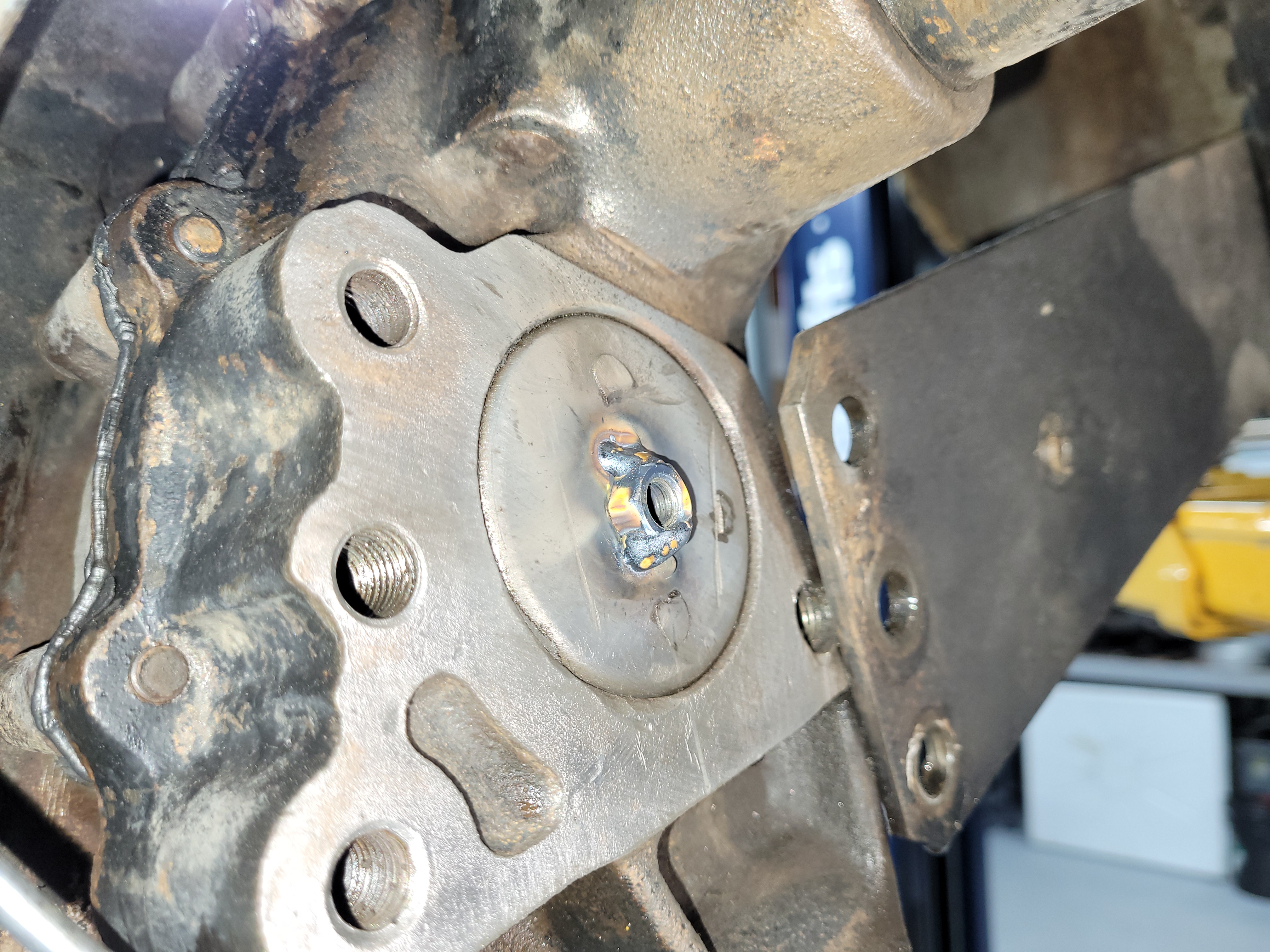 I chased all of the threads, replaced the messed up bolts, and installed the lock tabs and correct wave washer on the front bolts. Install brake line retainers and grommets. All were torqued to spec, 80 ft-lb.