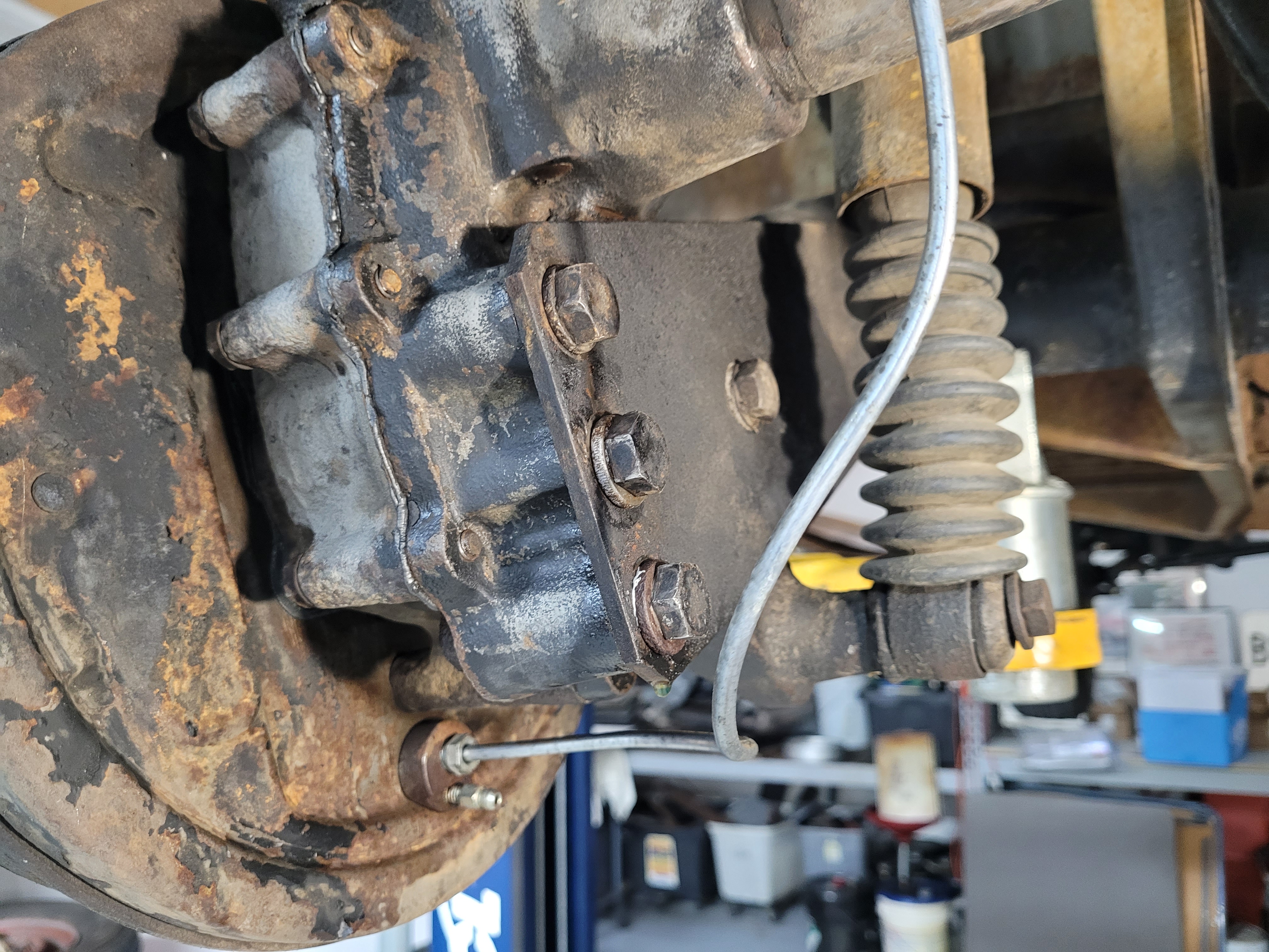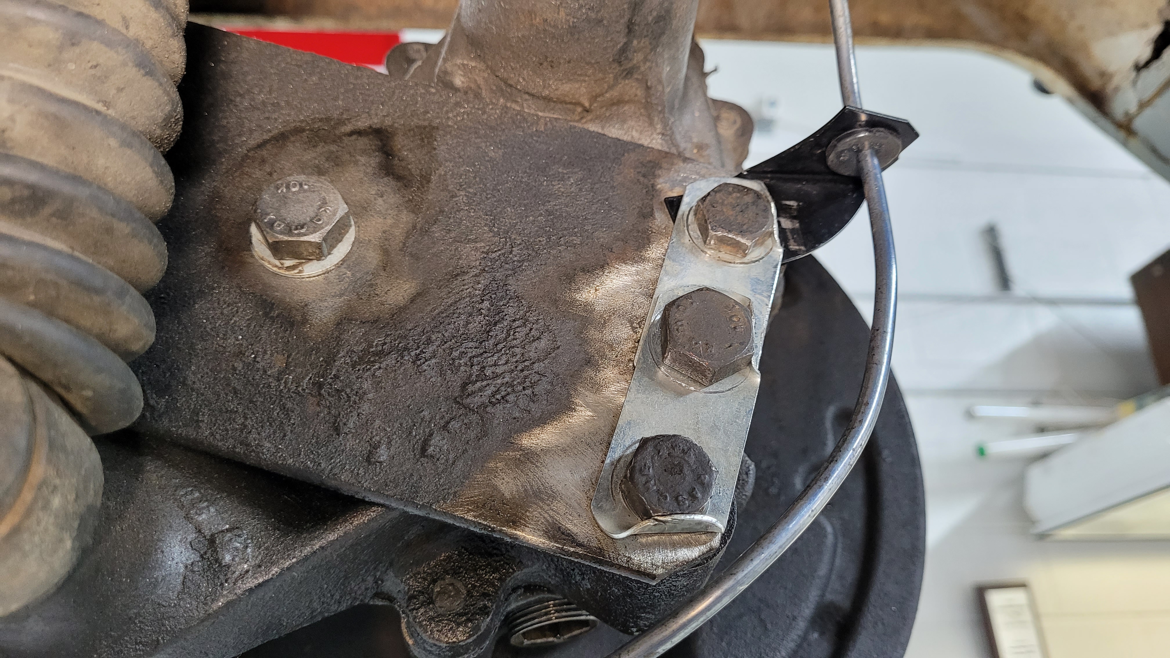 I chased all of the threads, replaced the messed up bolts, and installed the lock tabs and correct wave washer on the front bolts. Install brake line retainers and grommets. All were torqued to spec, 80 ft-lb.