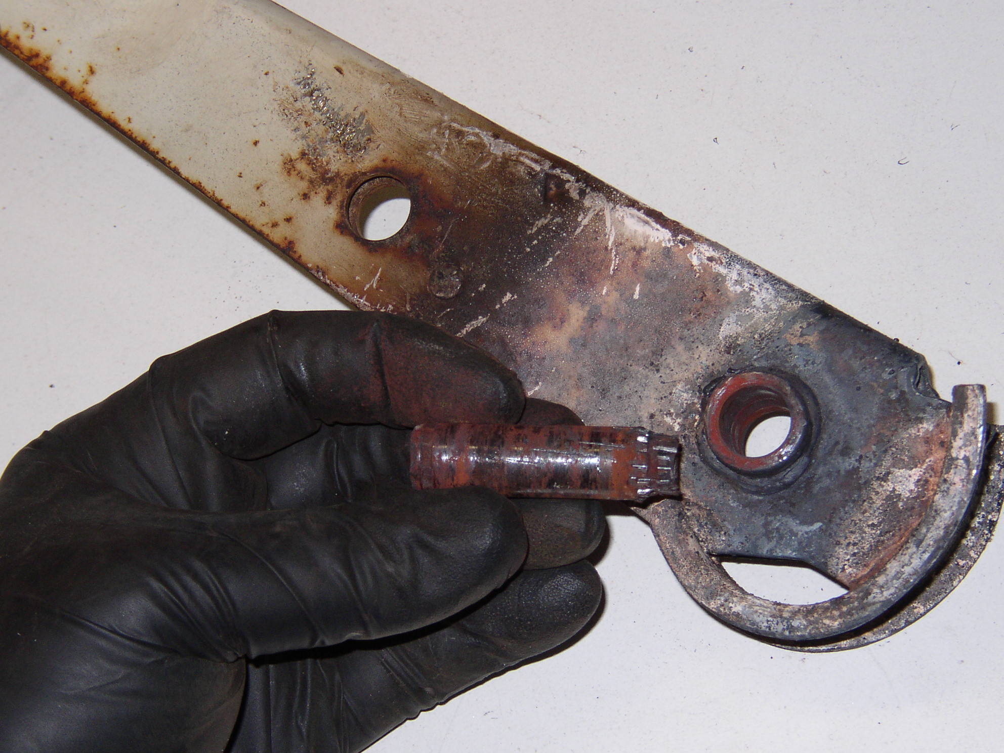 After wasting $20 worth of acetylene the $4 pin will finally come out. Just like the other one, after bead blasting the pin falls right through the hole in the lever.