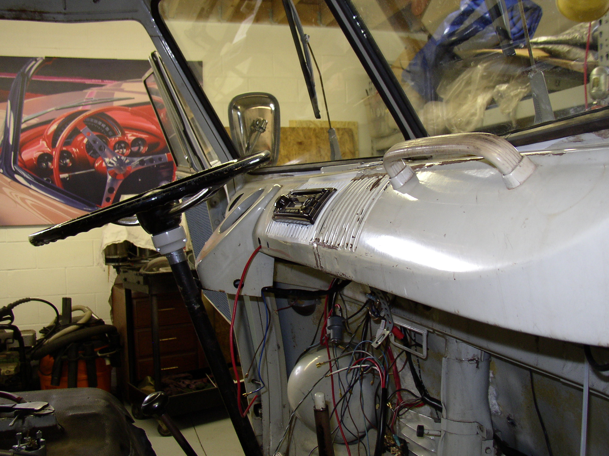 This bus had an unusually large dent in the dash and parcel tray. Something very big and heavy was not secured properly and hit the dash with a LOT of force when the driver hit the brakes. I straightened it out using a ball joint press and some stiff scrap. The starter stuck "on" even with the trigger wire unhooked so it got a new Napa permanent magnet (small, light) starter which was only $44 with a life warranty. I figured that was a good deal so I bought one for the shelf, too. Pics are in the camera at the shop right now but I did clean the flange well.