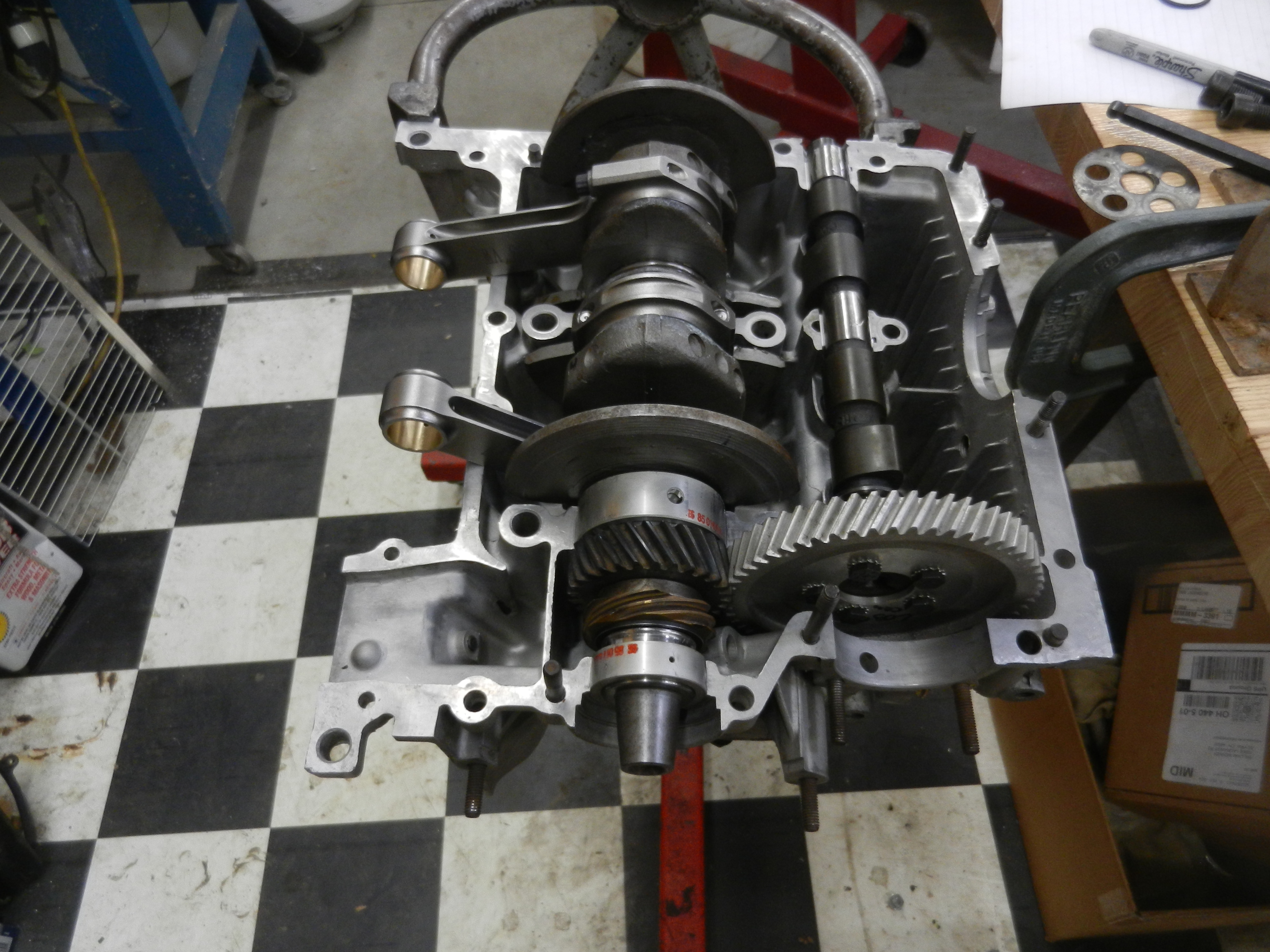 OK, I missed taking a pic of just the crank assembly seated in the case. Here, the camshaft is also installed. At this point, with or without the cam installed, we want to rotate the assemby to be sure everything rotates smoothly with no hang ups. rotating the crankshaft backwards,with the camshaft installed will also check backlash of the cam gear. Watch to see if the cam lifts out of the cam bearings or moves back and forth. If not, your good. If it does,you are going to need another cam gear. we were good here.